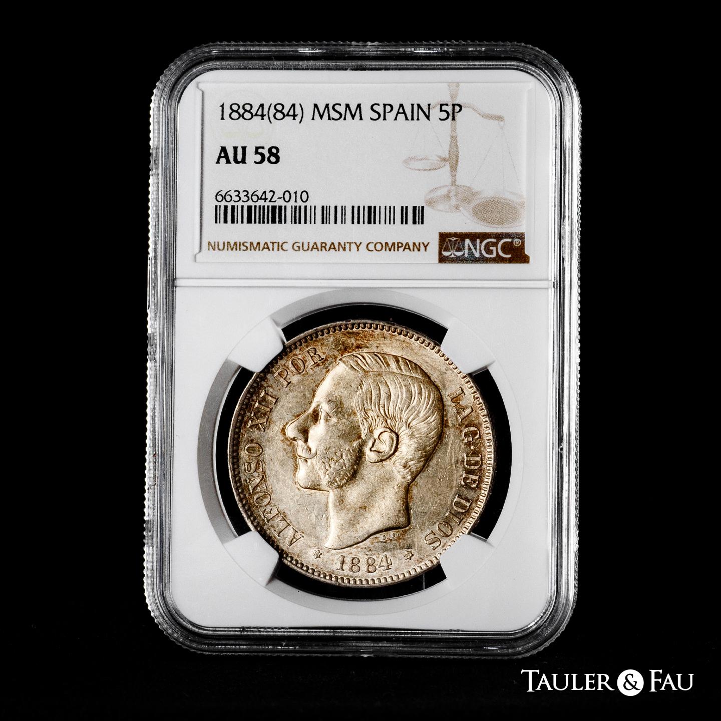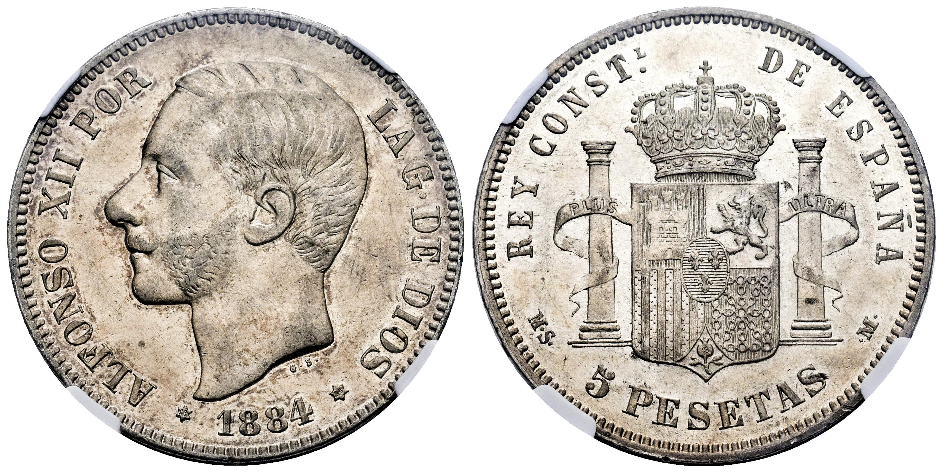 Centenario de la Peseta (1868-1931). Alfonso XII (1874-1885). 5 pesetas. 1884*18-84. Madrid. MSM. (Cal-57). Ag. Brillo original. Encapsulada por NGC como AU 58. Est...250,00.