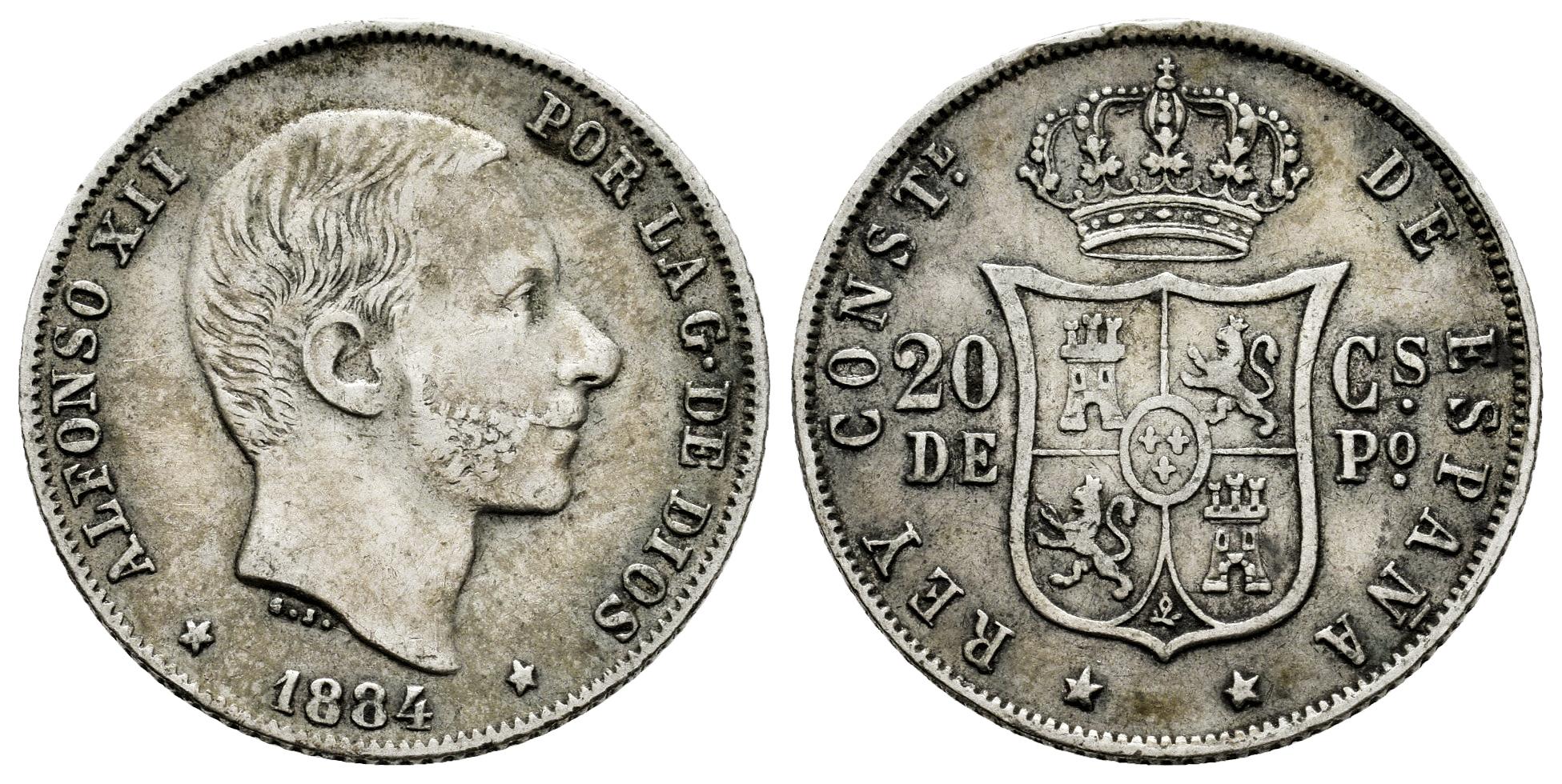 Centenario de la Peseta (1868-1931). Alfonso XII (1874-1885). 20 centavos. 1884. Manila. (Cal-110). Ag. 5,17 g. Escasa. MBC-. Est...100,00.