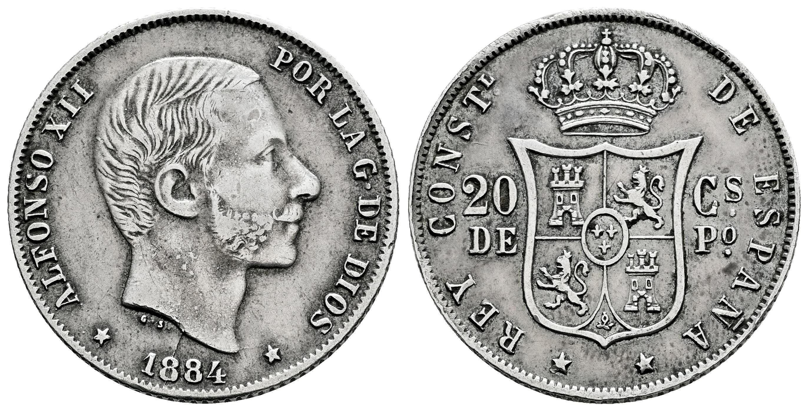 Centenario de la Peseta (1868-1931). Alfonso XII (1874-1885). 20 centavos. 1884. Manila. (Cal-110). Ag. 5,19 g. Escasa. MBC-. Est...100,00.