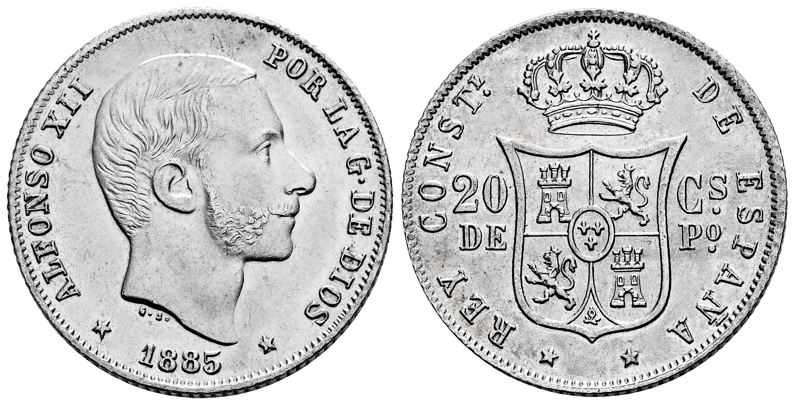 Centenario de la Peseta (1868-1931). Alfonso XII (1874-1885). 20 centavos. 1885. Manila. (Cal-111). Ag. 5,12 g. Restos de brillo original. EBC+. Est...300,00.