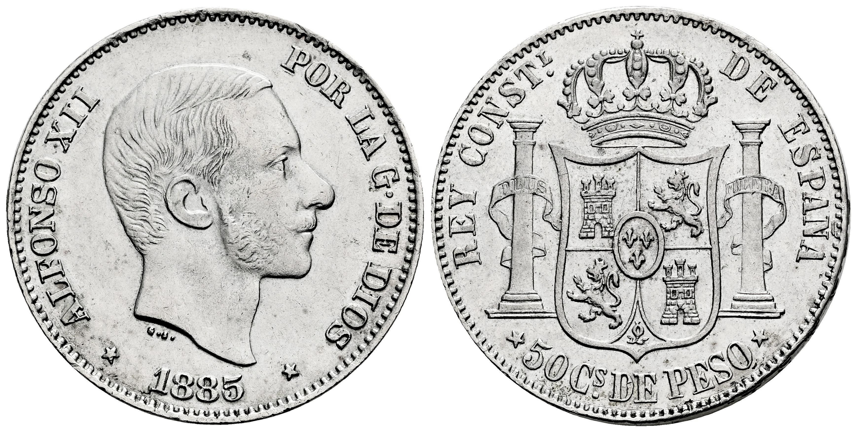 Centenario de la Peseta (1868-1931). Alfonso XII (1874-1885). 50 centavos. 1885/3. Manila. (Cal-123). Ag. 12,93 g. Restos de brillo original. Ex Soler&Llach (01/12/2021), lote 708. SC-. Est...70,00.