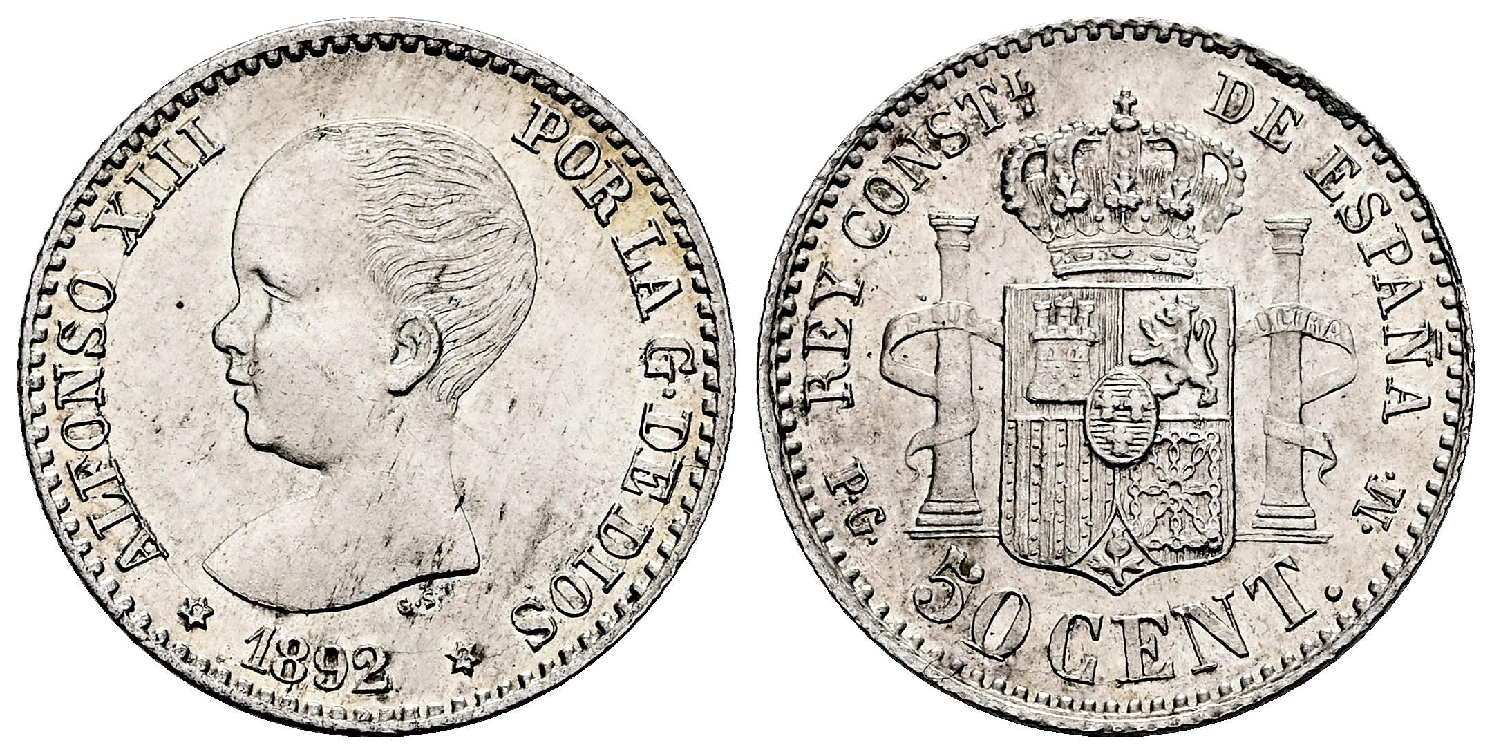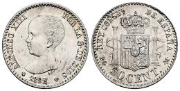 Centenario de la Peseta (1868-1931). Alfonso XIII (1886-1931). 50 céntimos. 1892*9-2. Madrid. PGM. (Cal-38). Ag. 2,50 g. Brillo original. EBC+. Est...50,00.