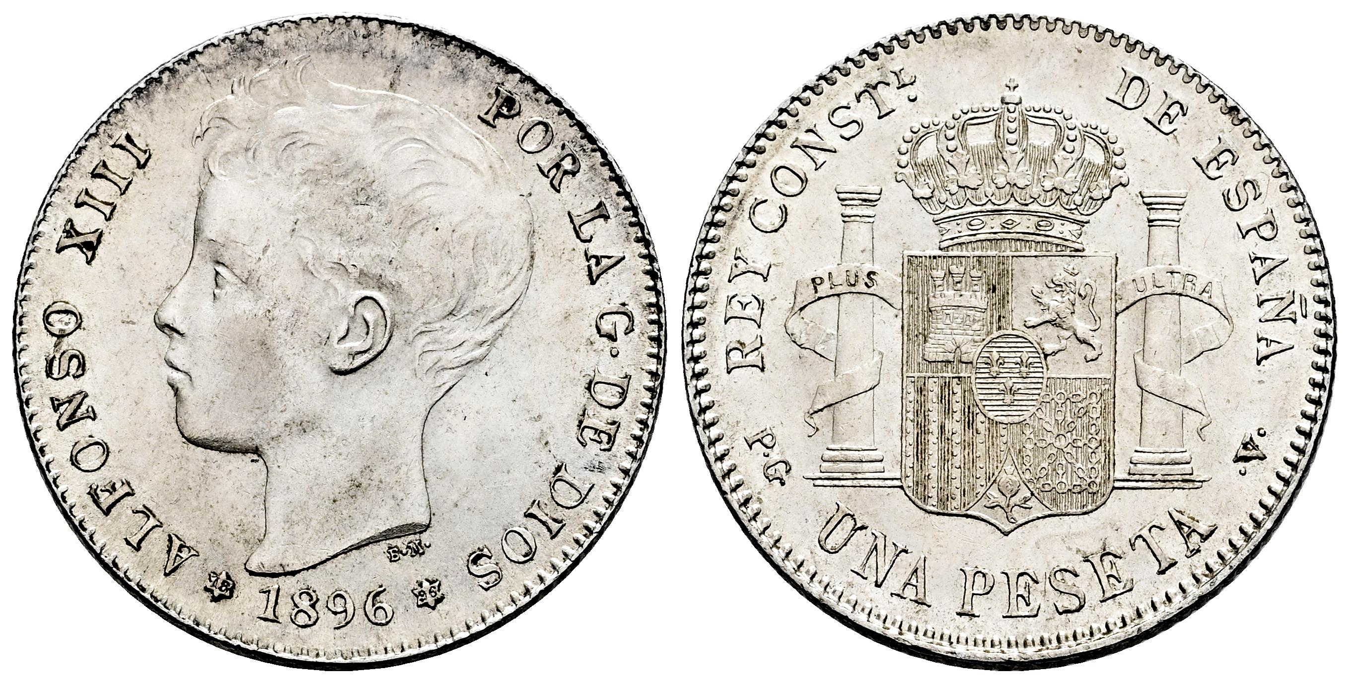 Centenario de la Peseta (1868-1931). Alfonso XIII (1886-1931). 1 peseta. 1896*18-96. Madrid. PGV. (Cal-56). Ag. 5,00 g. Restos de brillo original. EBC. Est...70,00.