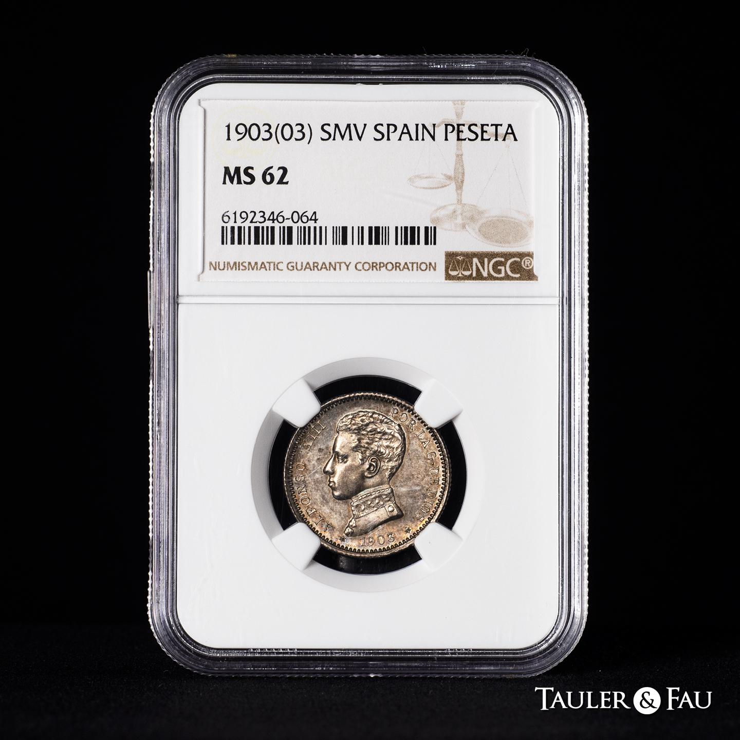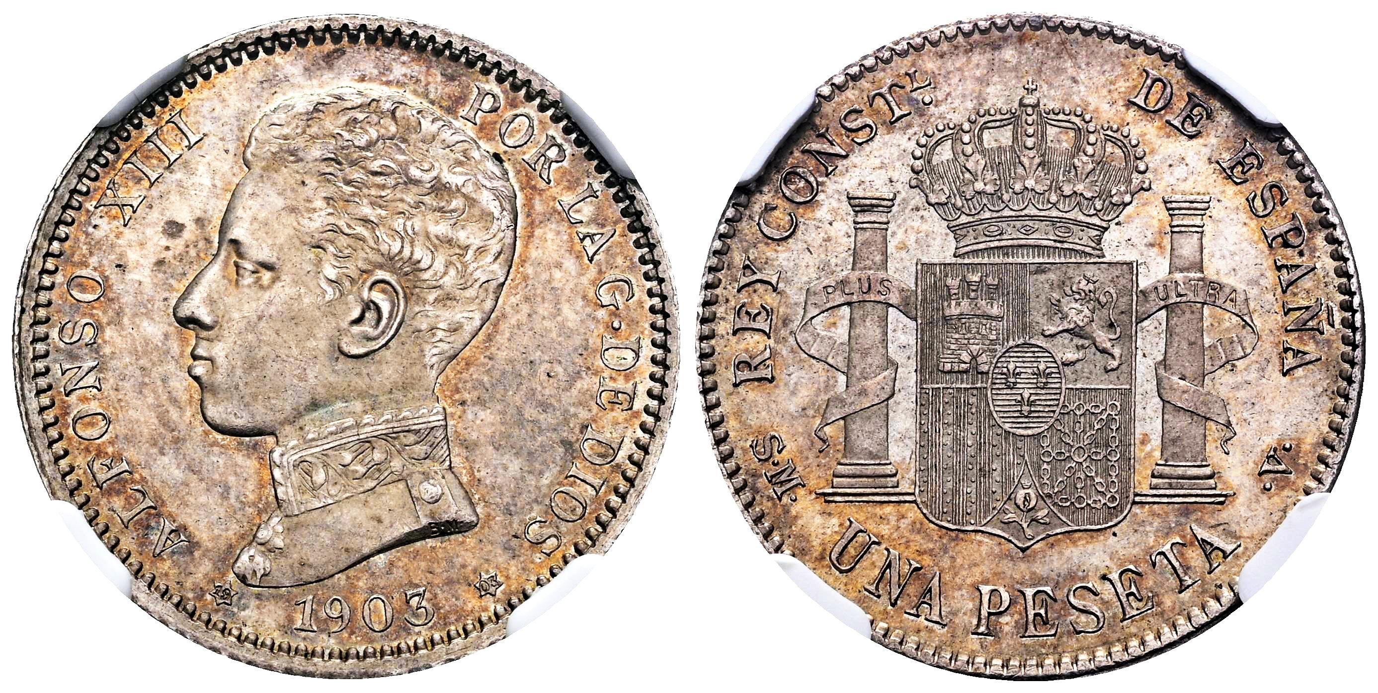 Centenario de la Peseta (1868-1931). Alfonso XIII (1886-1931). 1 peseta. 1903*19-03. Madrid. SMV. (Cal-67). Ag. Bonita pátina irisada. Brillo original. Encapsulada por NGC como MS 62. Ex Tauler&Fau 154 (17/02/2025), lote 2352. Est...150,00.