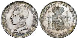 Centenario de la Peseta (1868-1931). Alfonso XIII (1886-1931). 5 pesetas. 1905*19-05. Madrid. SMV. (Cal-88). Ag. 9,99 g. Pleno brillo original con ligero tono. Marquitas en anverso. EBC+/SC. Est...40,00.
