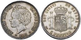 Centenario de la Peseta (1868-1931). Alfonso XIII (1886-1931). 5 pesetas. 1892*18-92. Madrid. PGM. (Cal-100). Ag. 25,10 g. Suave pátina. Restos de brillo original. MBC+/EBC-. Est...100,00.