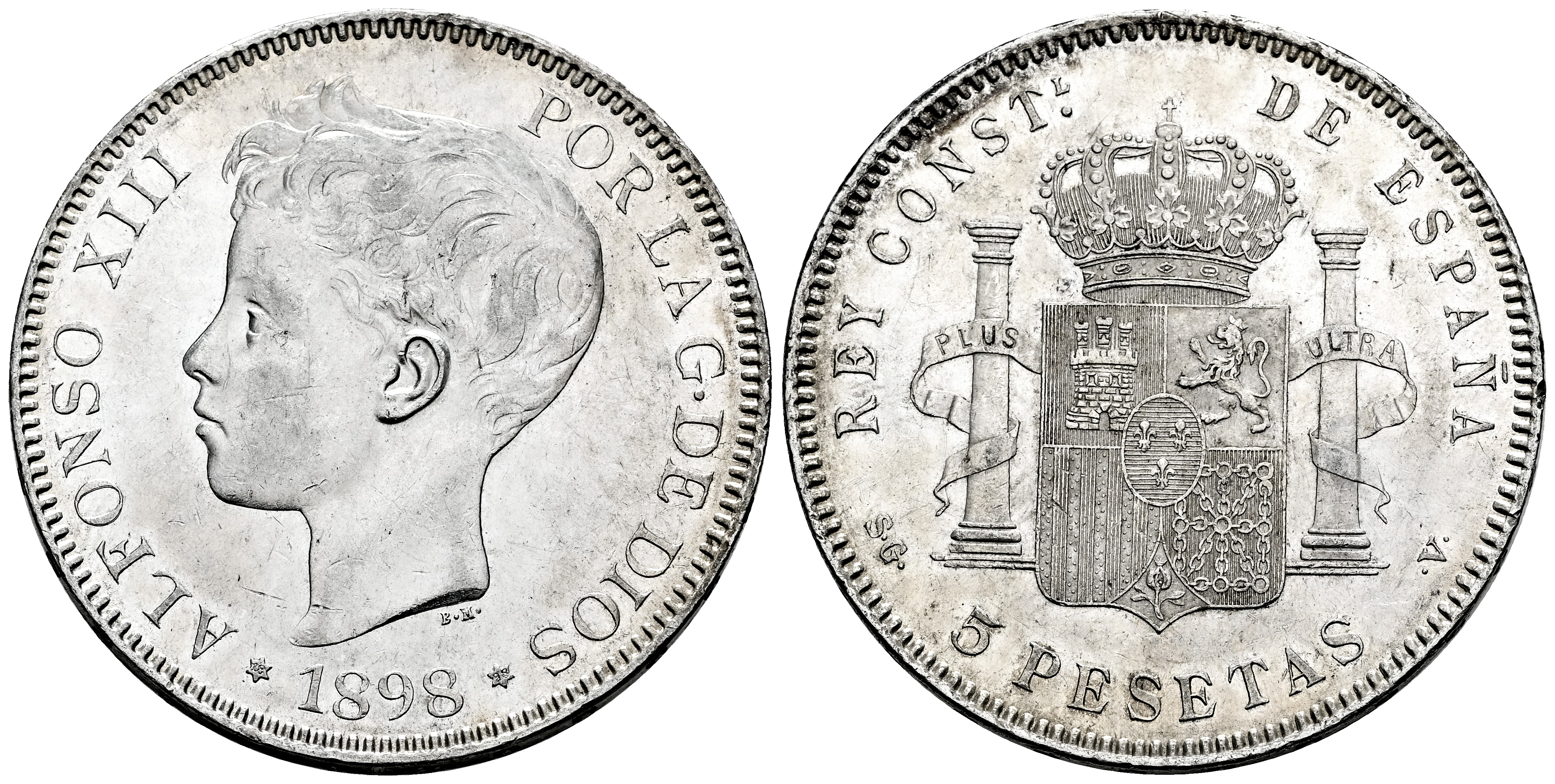 Centenario de la Peseta (1868-1931). Alfonso XIII (1886-1931). 5 pesetas. 1898*18-98. Madrid. SGV. (Cal-109). Ag. 24,90 g. Rayitas y golpecitos en el canto. Restos de brillo original. MBC+/EBC-. Est...50,00.