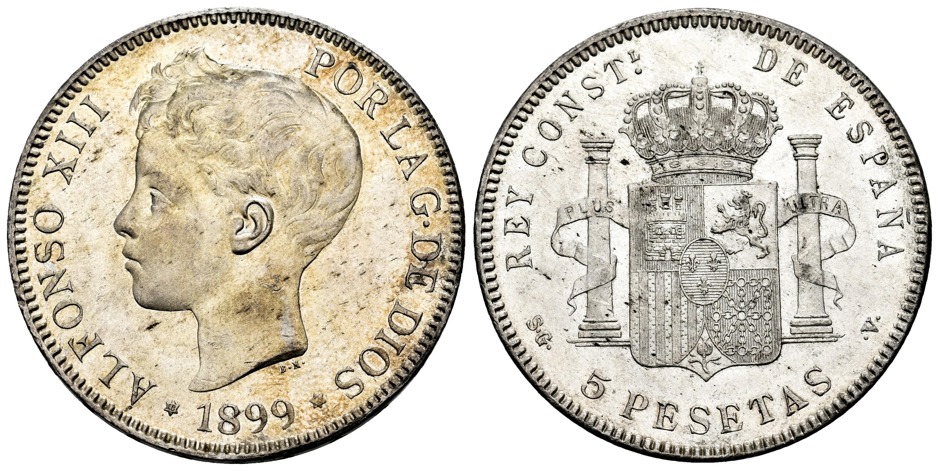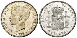 Centenario de la Peseta (1868-1931). Alfonso XIII (1886-1931). 5 pesetas. 1899*18-99. Madrid. SGV. (Cal-110). Ag. 25,08 g. Leves marquitas. Brillo original. EBC+. Est...100,00.