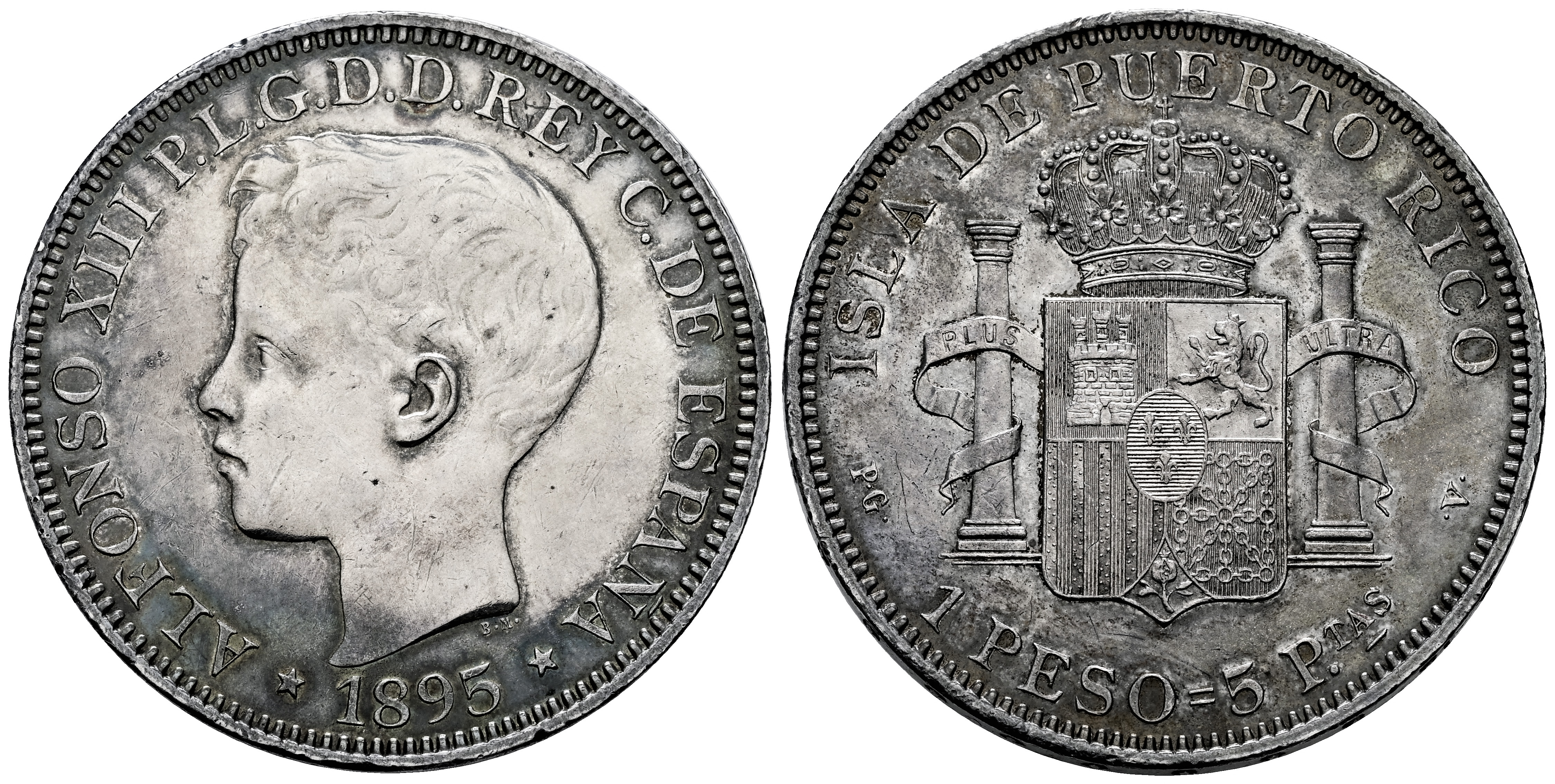 Centenario de la Peseta (1868-1931). Alfonso XIII (1886-1931). 1 peso. 1895. Puerto Rico. PGV. (Cal-128). Ag. 25,03 g. Golpecitos en el canto y leves marquitas. Suave y atractivo tono. Ligeramente limpiada. Rara. EBC-/EBC. Est...600,00.