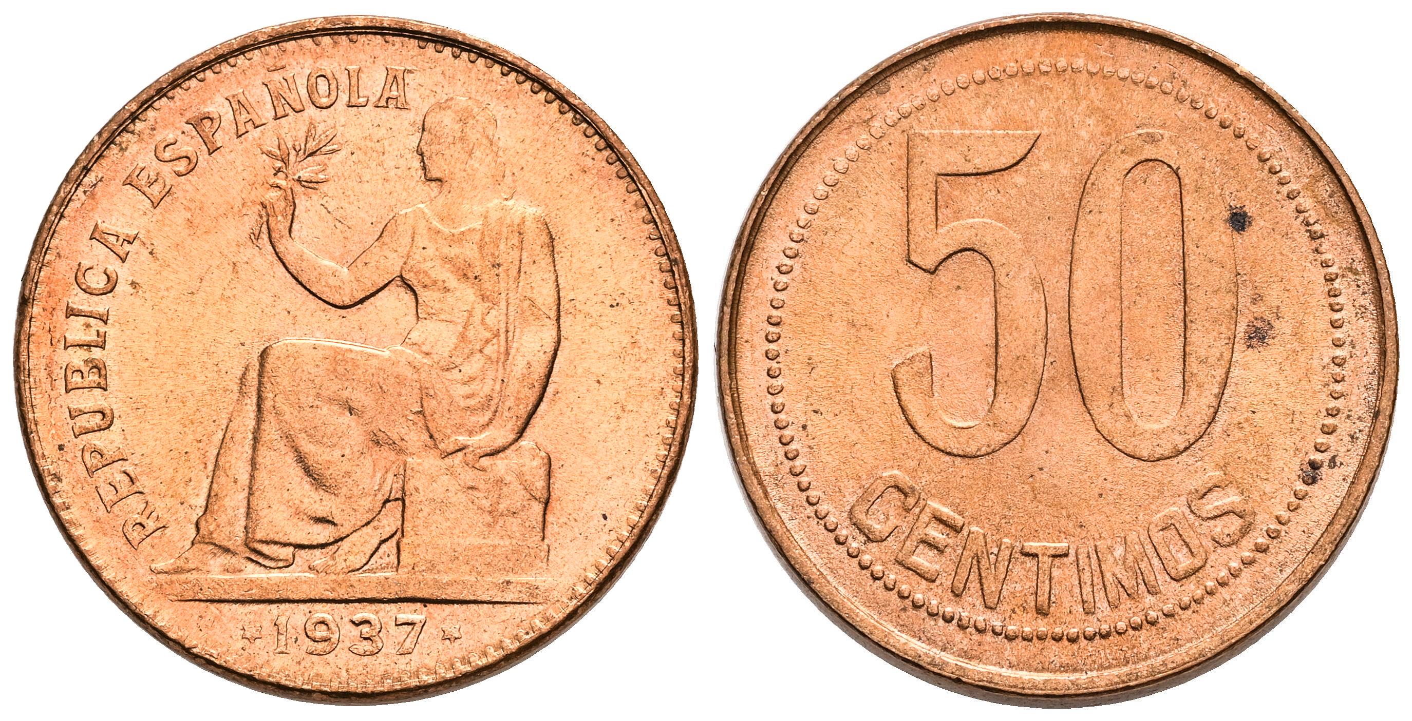 II República (1931-1939). 50 céntimos. 1937. Madrid. (Cal-27). Ae. 6,12 g. Brillo original. SC-. Est...35,00.