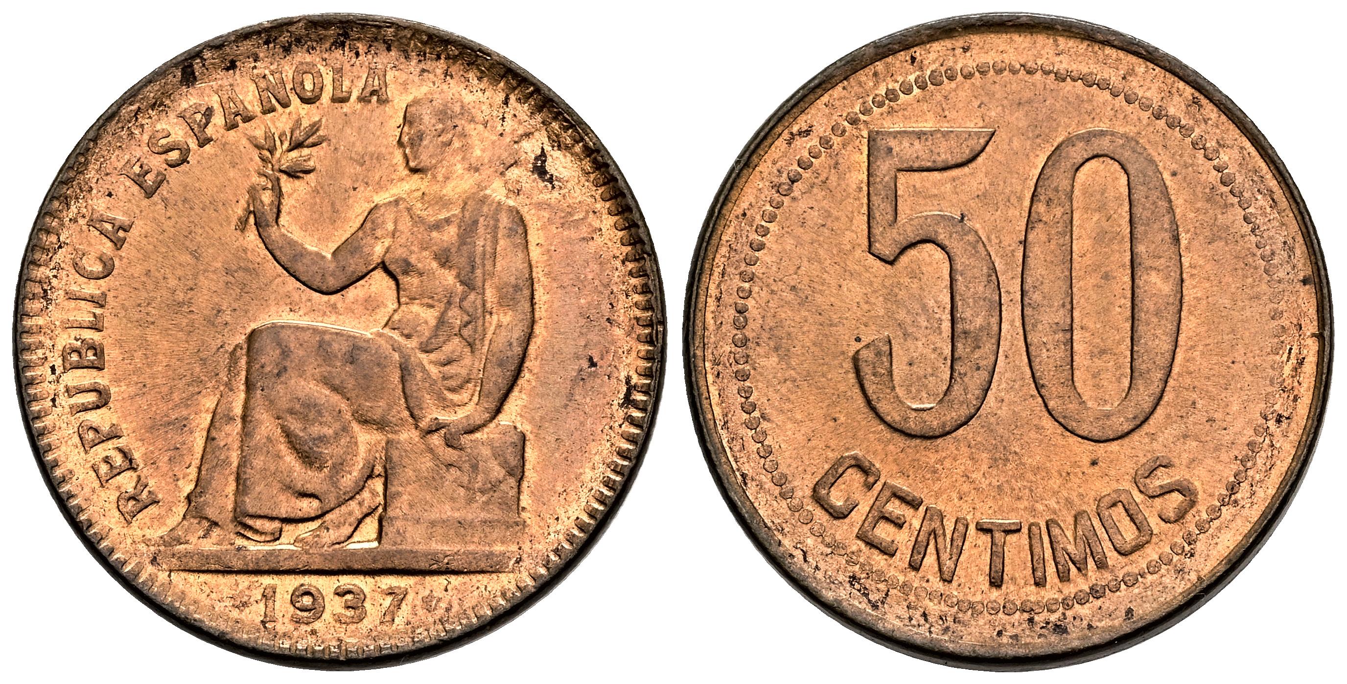 II República (1931-1939). 50 céntimos. 1937. Madrid. (Cal-27). Ae. 5,94 g. Hojita en el anverso. Restos de brillo original. EBC. Est...30,00.