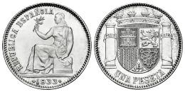 II República (1931-1939). 1 peseta. 1933*3-4. Madrid. (Cal-34). Ag. 4,97 g. Pleno brillo original. SC. Est...45,00.
