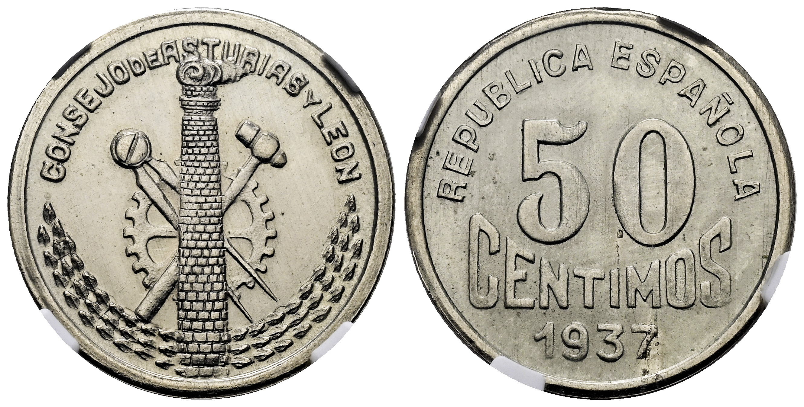 Guerra Civil (1936-1939). 50 céntimos. 1937. Asturias y León. (Cal-8). Cu-Ni. Error del mundial. Encapsulada por NGC como MS 63. Est...150,00.