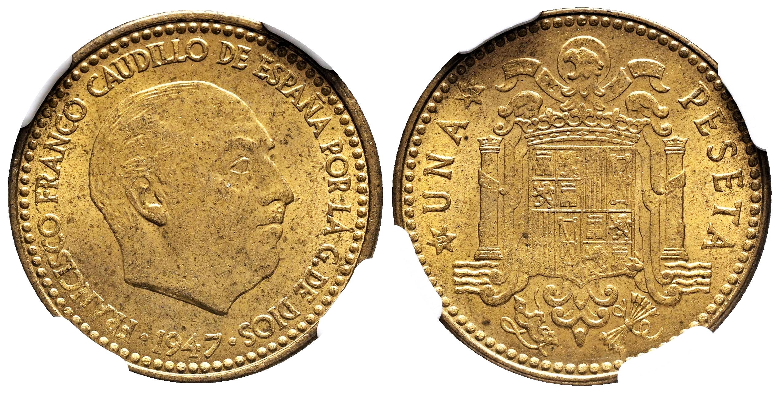 Estado Español (1936-1975). 1 peseta. 1947*19-53. Madrid. (Cal-53). Al-Cu. Encapsulada por NGC como MS 65. Solamente 1 ejemplar mejor conservado según el censo de NGC. Est...150,00.