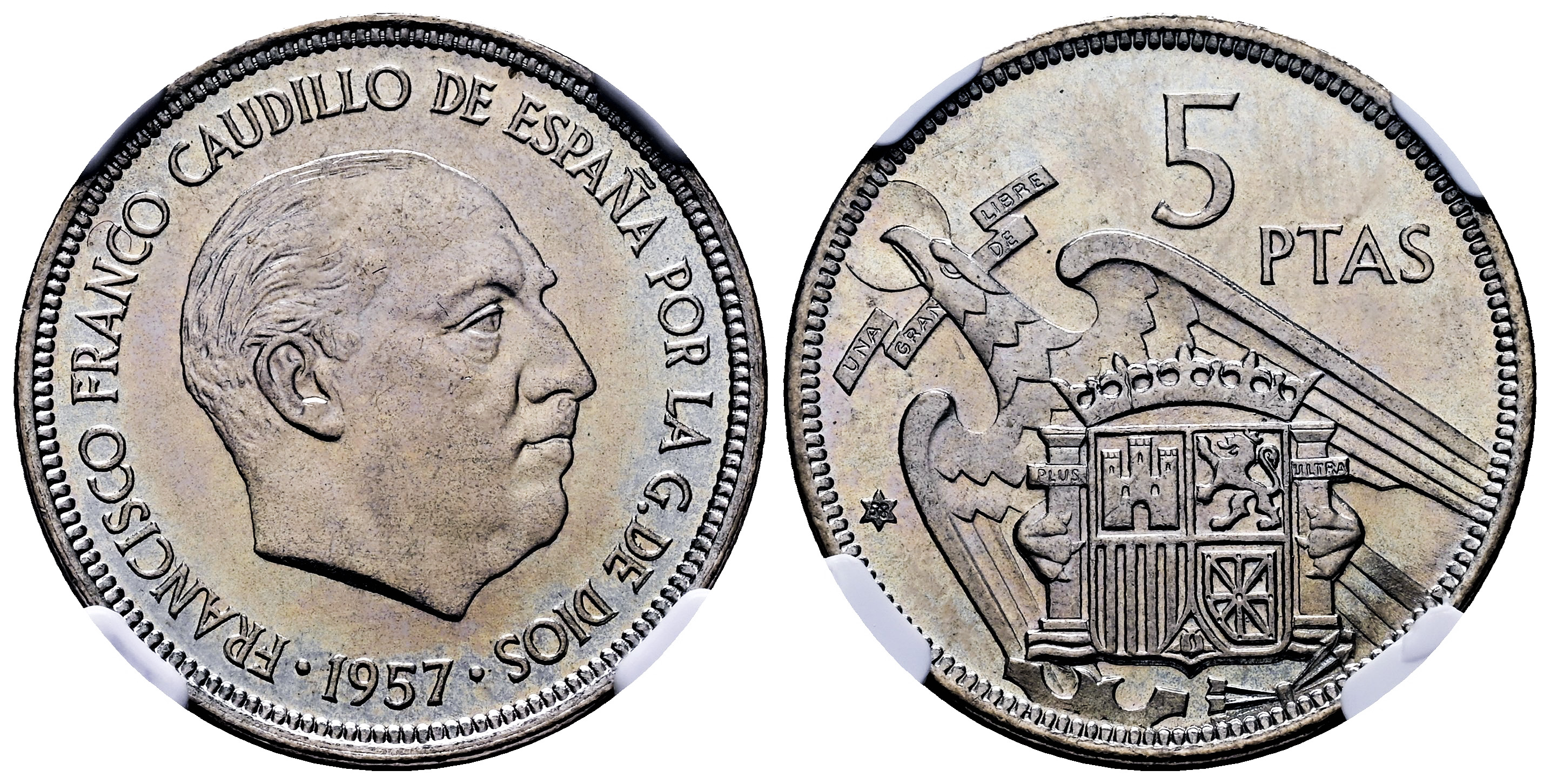 Estado Español (1936-1975). 5 pesetas. 1957*58. Madrid. (Cal-98). Cu-Ni. Encapsulada por NGC como MS 64. Est...90,00.