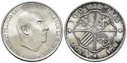 Estado Español (1936-1975). 100 pesetas. 1966*19-69. Madrid. (Cal-148). Ag. 19,09 g. Palo curvo. Brillo original. Ligero tono en reverso. Escasa. SC-. Est...180,00.