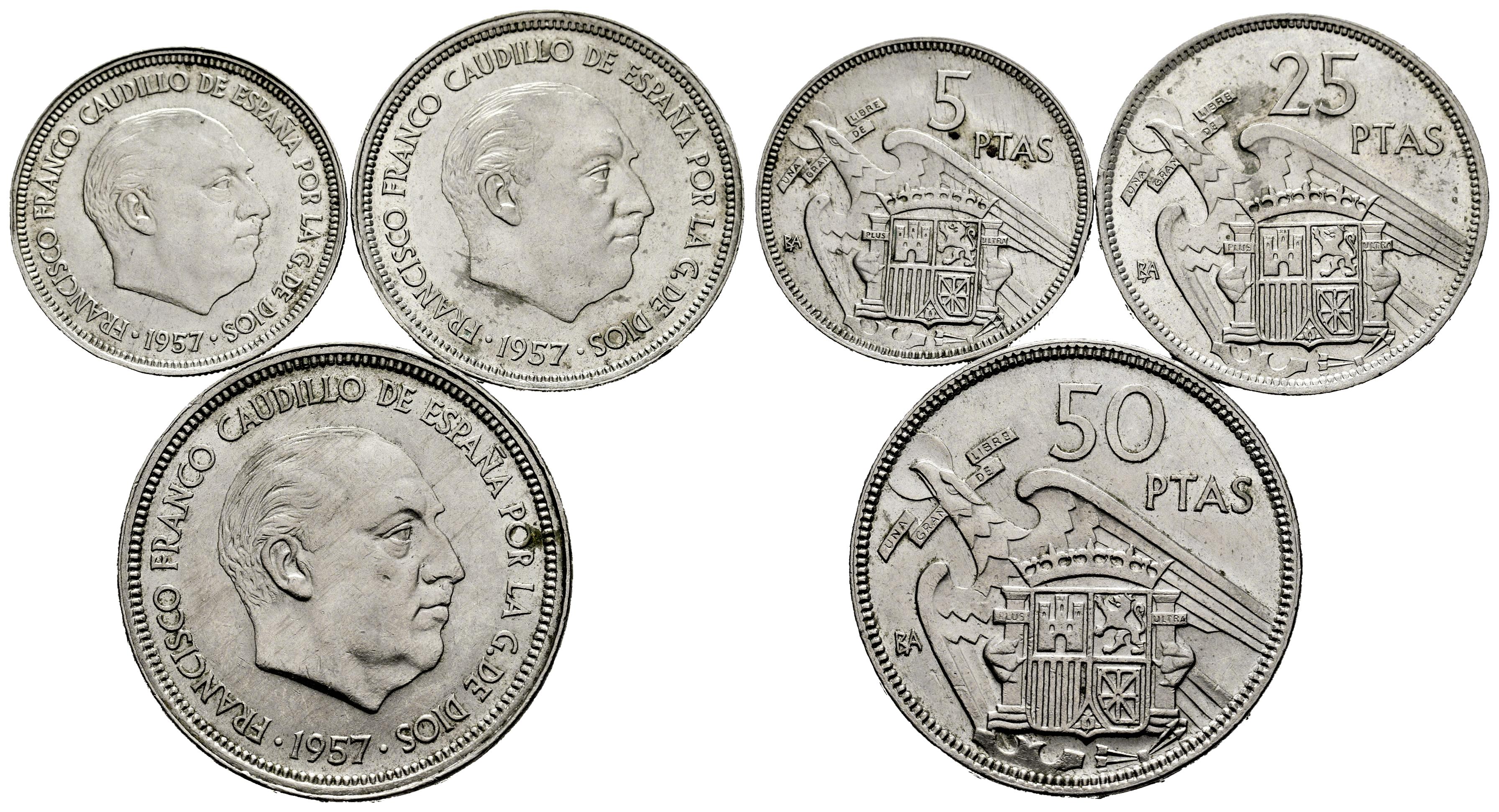 Estado Español (1936-1975). Serie completa. 1957. Barcelona. BA. (Cal-154/55/56). Cu-Ni. I Exposición Iberoamericana de Numismática. EBC/EBC+. Est...140,00.