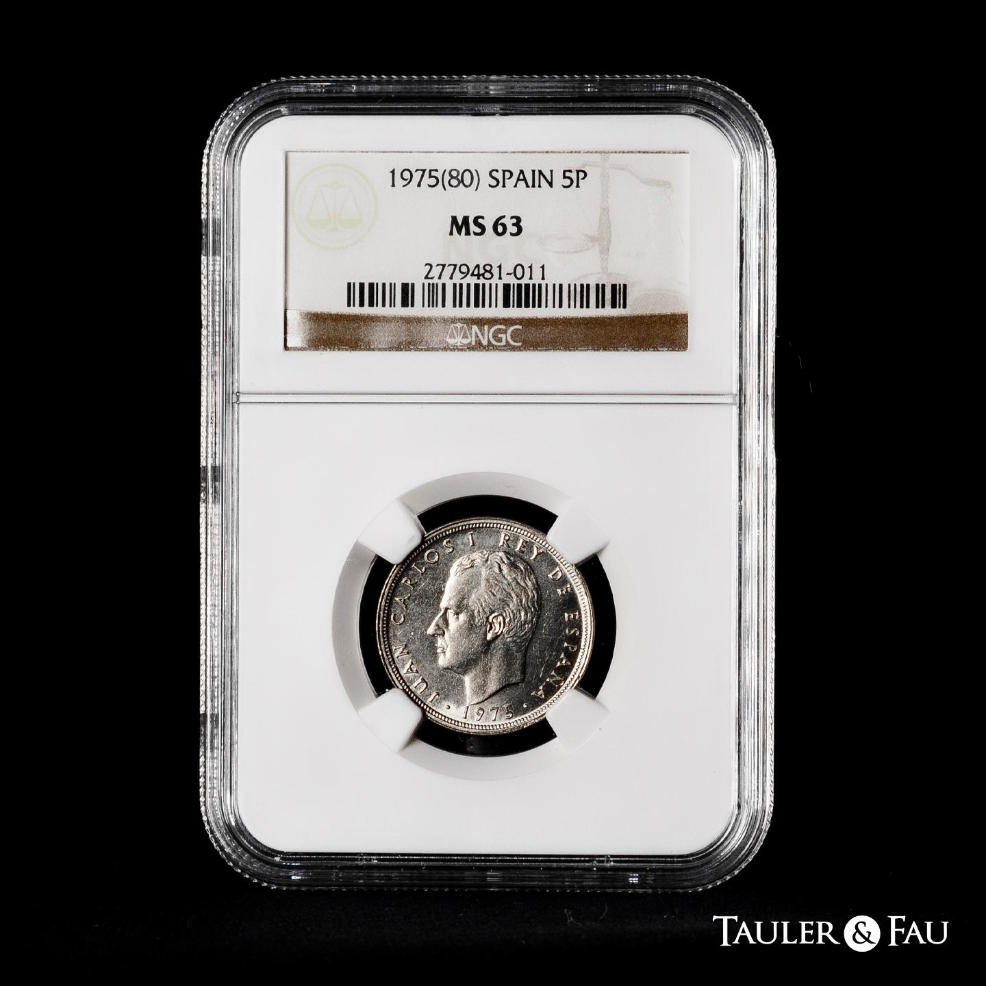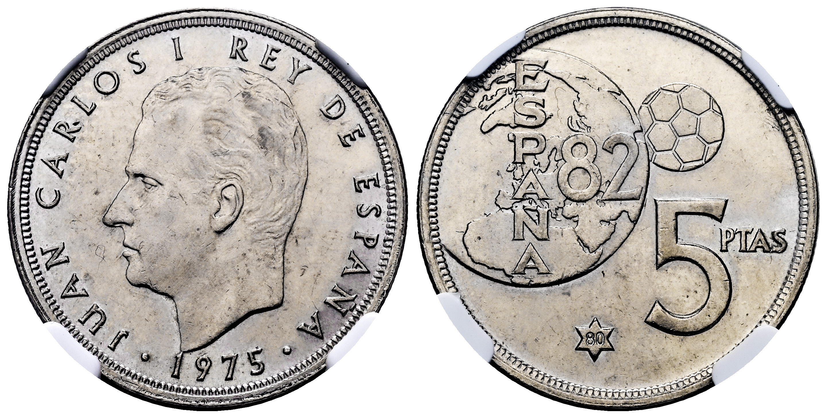 Juan Carlos I (1975-2014). 5 pesetas. 1975*80. Madrid. (Cal-40). Cu-Ni. Error del mundial. Encapsulada por NGC como MS 63. NGC-MS. Est...150,00.