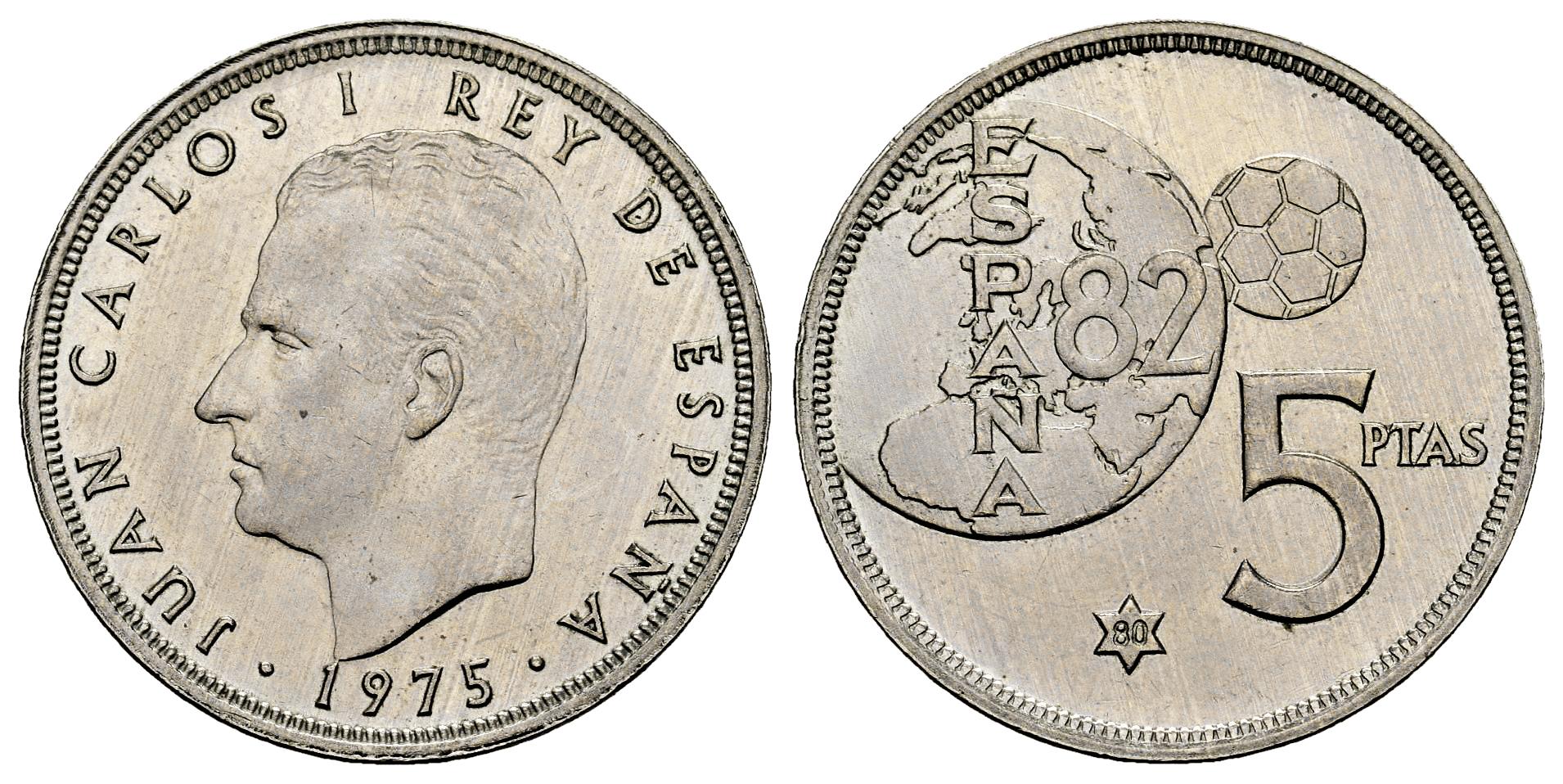 Juan Carlos I (1975-2014). 5 pesetas. 1975*80. Madrid. (Cal-40). Cu-Ni. 5,71 g. Error del mundial. SC-. Est...140,00.