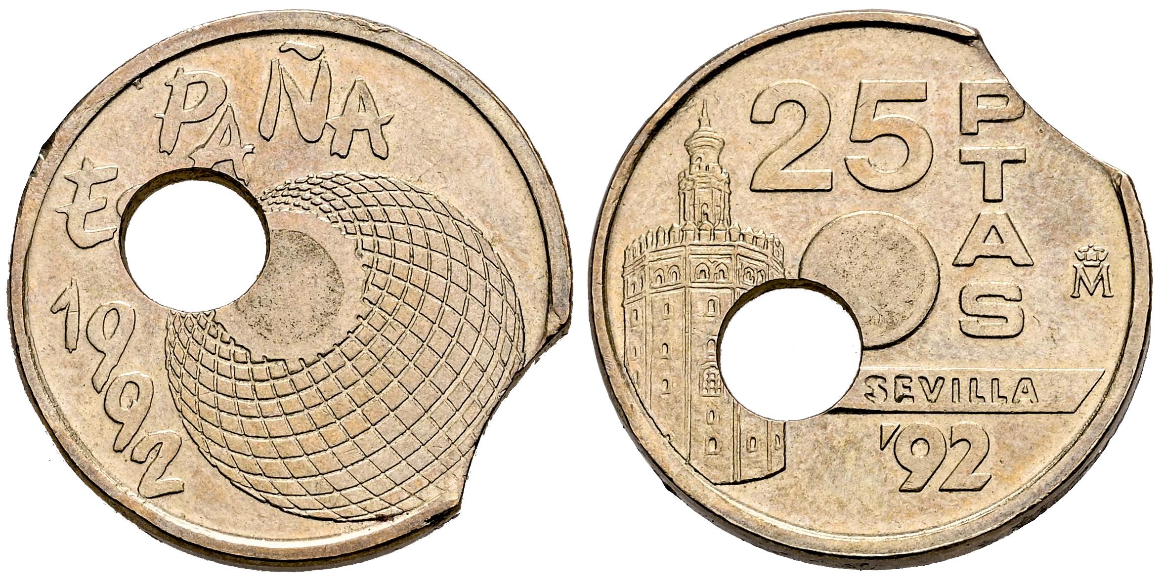Juan Carlos I (1975-2014). Error. 25 pesetas. 1992. Madrid. (Cal-88). Cu-Ni. 4,07 g. Agujero muy desplazado. Defecto cospel. SC. Est...60,00.