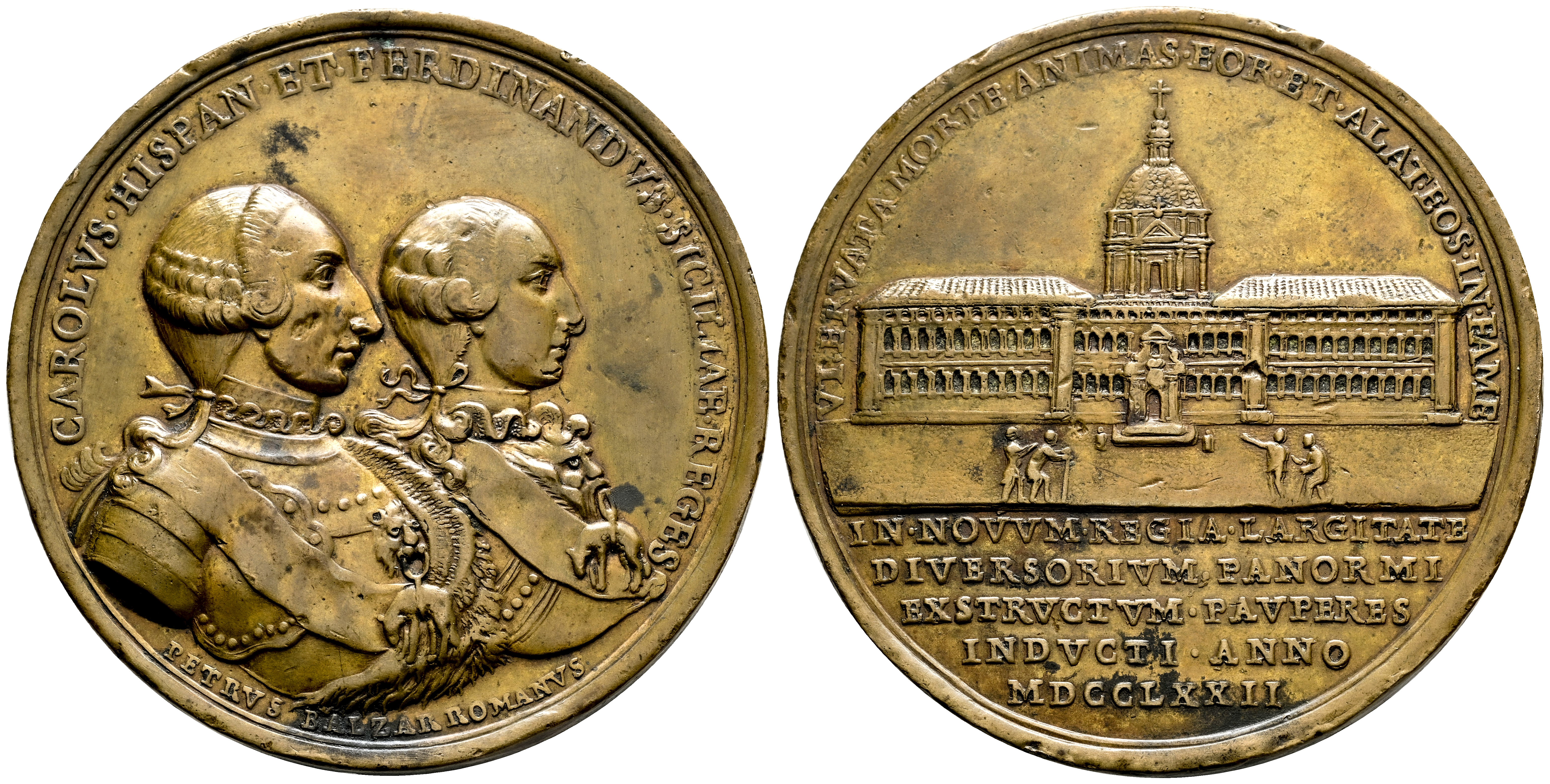 Infantes de España. Medalla. 1772. (Vq-1418). Ae. 62,27 g. Carlos III y Fernando de Sicilia conmemorando la construcción del hospital para pobres de Palermo. Golpecitos en el canto. Gr.: Petrus Balzar. 53 mm. Rara . EBC. Est...250,00.