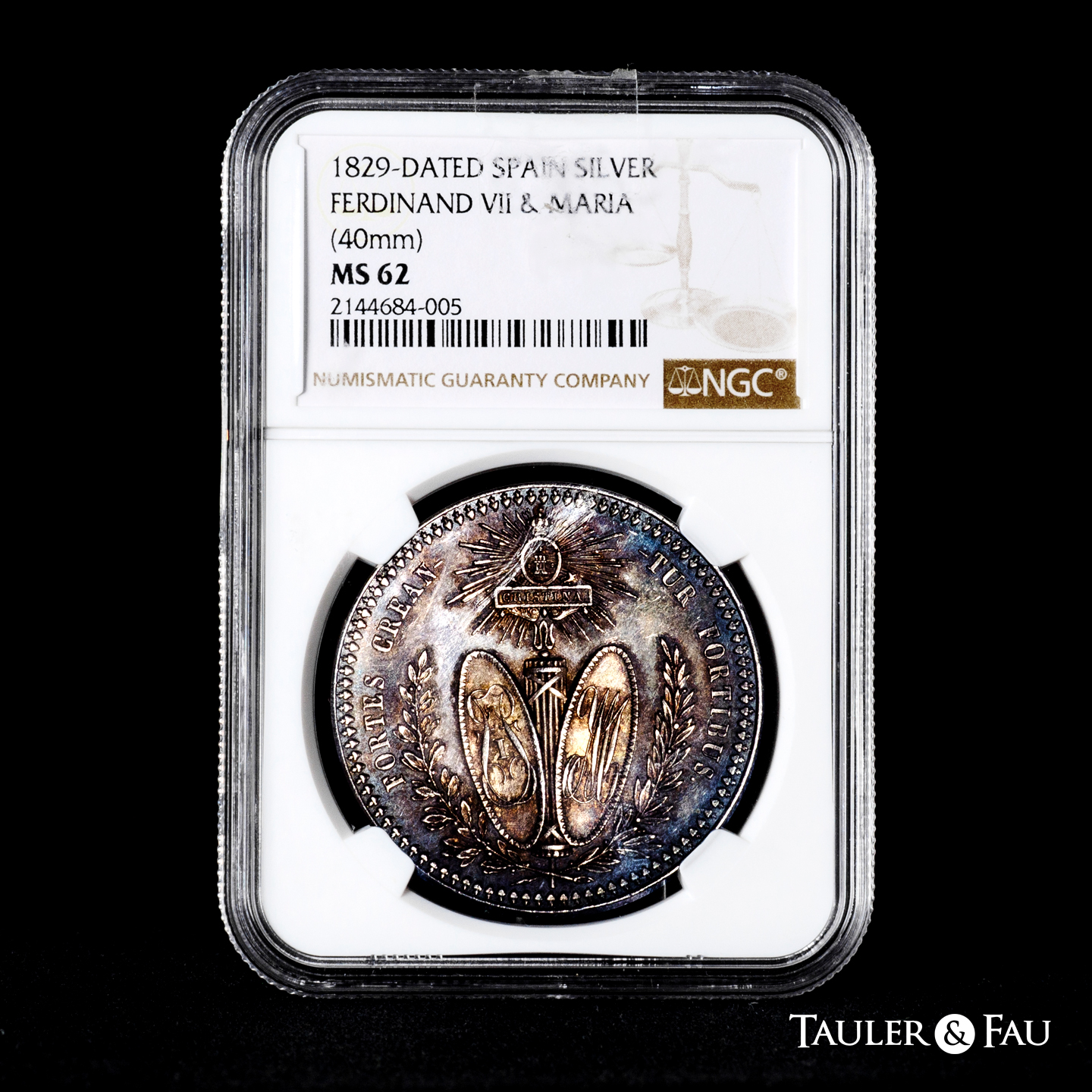Fernando VII (1808-1833). Medalla. 11 Diciembre 1829. Matrimonio de María Cristina de Borbón y Fernando VII. (Vq-No cita). (Rah-569). Anv.: Entre dos ramas de laurel, dos medallones con las siglas FF e I en el de la izqda y en el de la dcha. Y-M. Encima fasces que sostienen una cartela con el nombre CRISTINA. Sobre ésta un escudete coronado y refulgente con un castillo en su interior. Leyenda circular externa: FORTES CREAN - TUR FORTIBUS. Rev.: FRANCISCO I./ UTRIUSQUE SICILIAE/ REGI OPTIMO/ ET AUGUSTAE CONJUGI/ ELISABETHAE/ NUPTA CHARA FILIA/ HISPANIA LAETA./ XI DECEMBRIS MDCCXXVIIII . Ag. 40mm. Rara. Encapsulada por NGC como MS 62. Est...250,00.