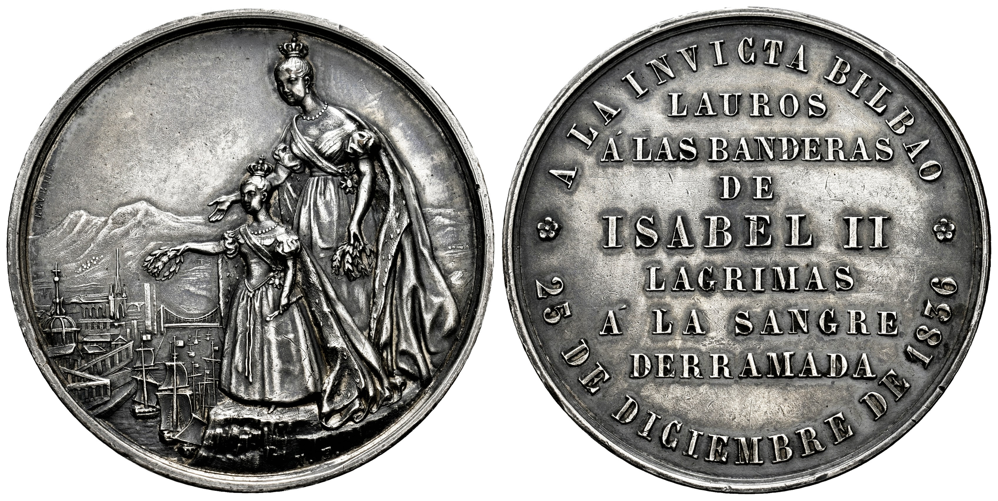Isabel II (1833-1868). Medalla. 1836. Bilbao. (Vives-773). (Vq-14267). Ae. 27,17 g. A los Defensores del Segundo Levantamiento. Grabador: Massonet. Plateada. 41 mm. EBC+. Est...120,00.