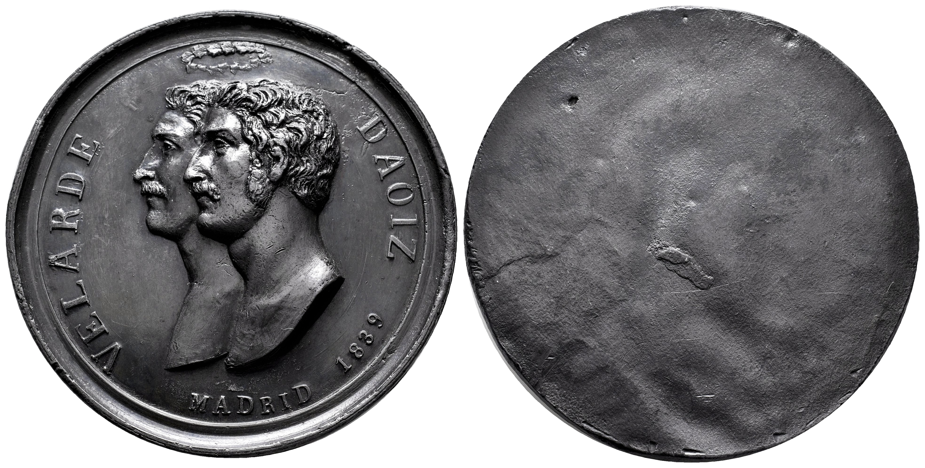 Isabel II (1833-1868). Medalla unifaz. 1839. Madrid. En memoria de Daoiz y Velarde, héroes del Parque de Monteleón (1808). (Vives-368/XVII-6 var.). Pb. 162,00 g. Ensayador: Basilio Sebastián Castellanos. 84mm. Rara. EBC. Est...110,00.