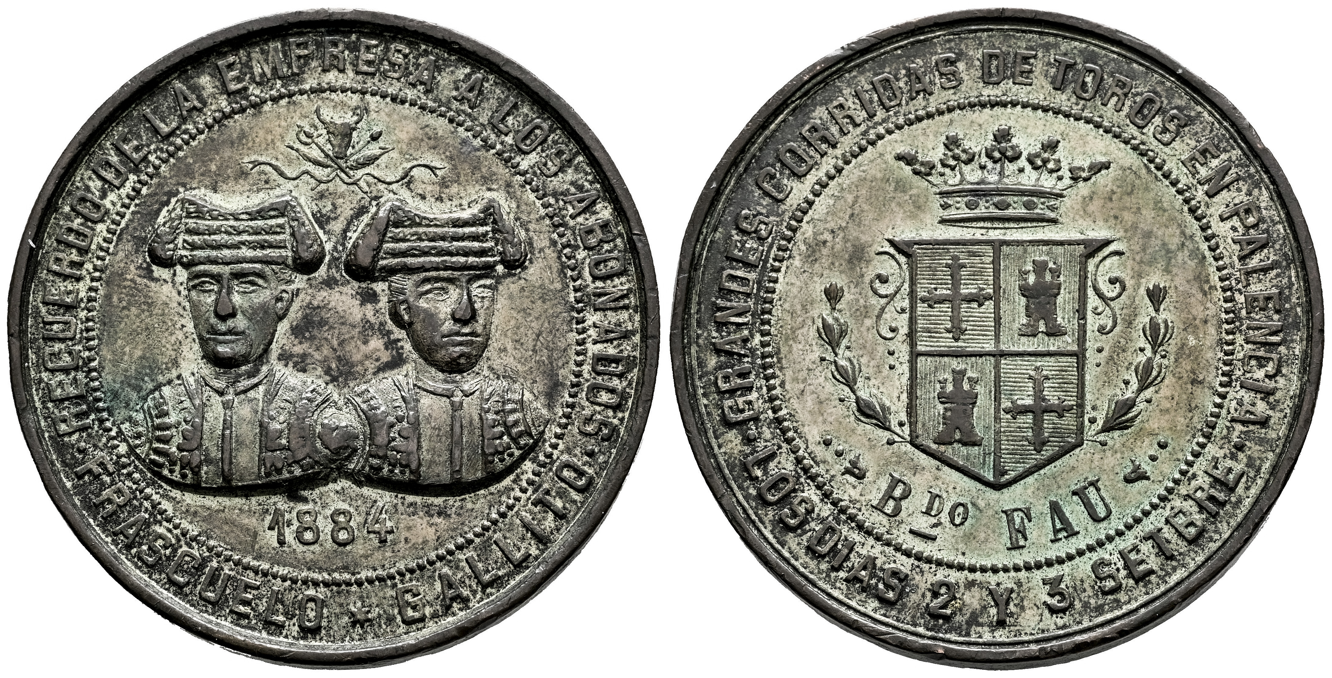 Medalla. 1884. Palencia. Calamina. 21,87 g. Frascuelo y Gallito. Corrida en Palencia. Recuerdo a los abonados de la Plaza de Toros de Palencia. 37 mm. Golpecitos en el canto. Pátina irregular. MBC+. Est...80,00.