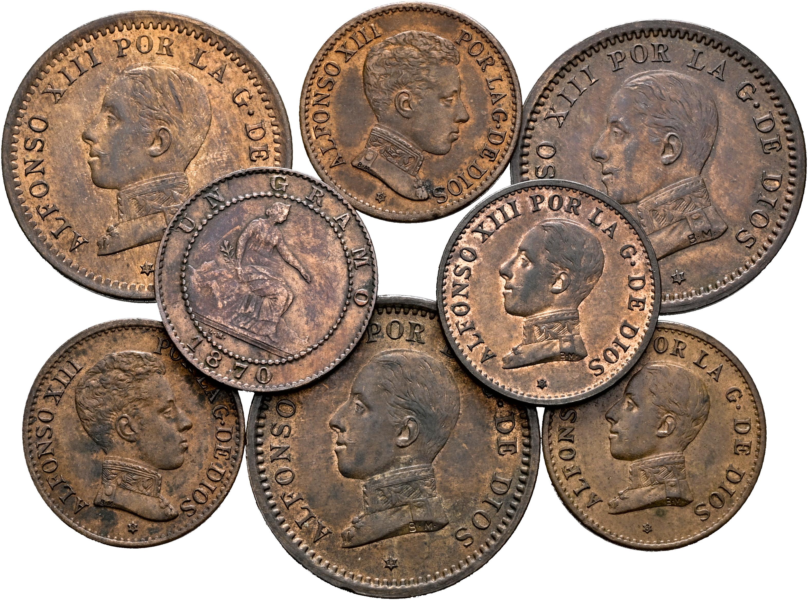 Lote de 8 monedas de cobre del Centenario; 5 de 1 céntimo (1870, 2 de 1906, 2 de 1913) y 3 de 2 céntimos 1911. Es imprescindible un riguroso examen. SOLO ENVÍO A ESPAÑA PENÍNSULA. NO SE ADMITE DEVOLUCIÓN. EBC+/SC. Est...100,00.