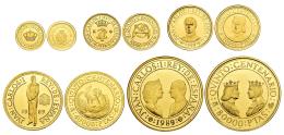 Juan Carlos I (1975-2014). Serie completa de 5.000, 10.000, 20.000, 40.000 y 80.000 Pesetas. 1989. Madrid. (Km-840, 842, 843, 844 y 845). 1,65 g., 3,35 g., 6,74 g., 13,44 g. y 26,87 g. Au. Quinto Centenario del Descubrimiento de América. Rosa de los vientos, Esfera armilar, Martín Alonso Pinzón, Mar Negro y Reyes Católicos. PROOF. Est...6000,00.
