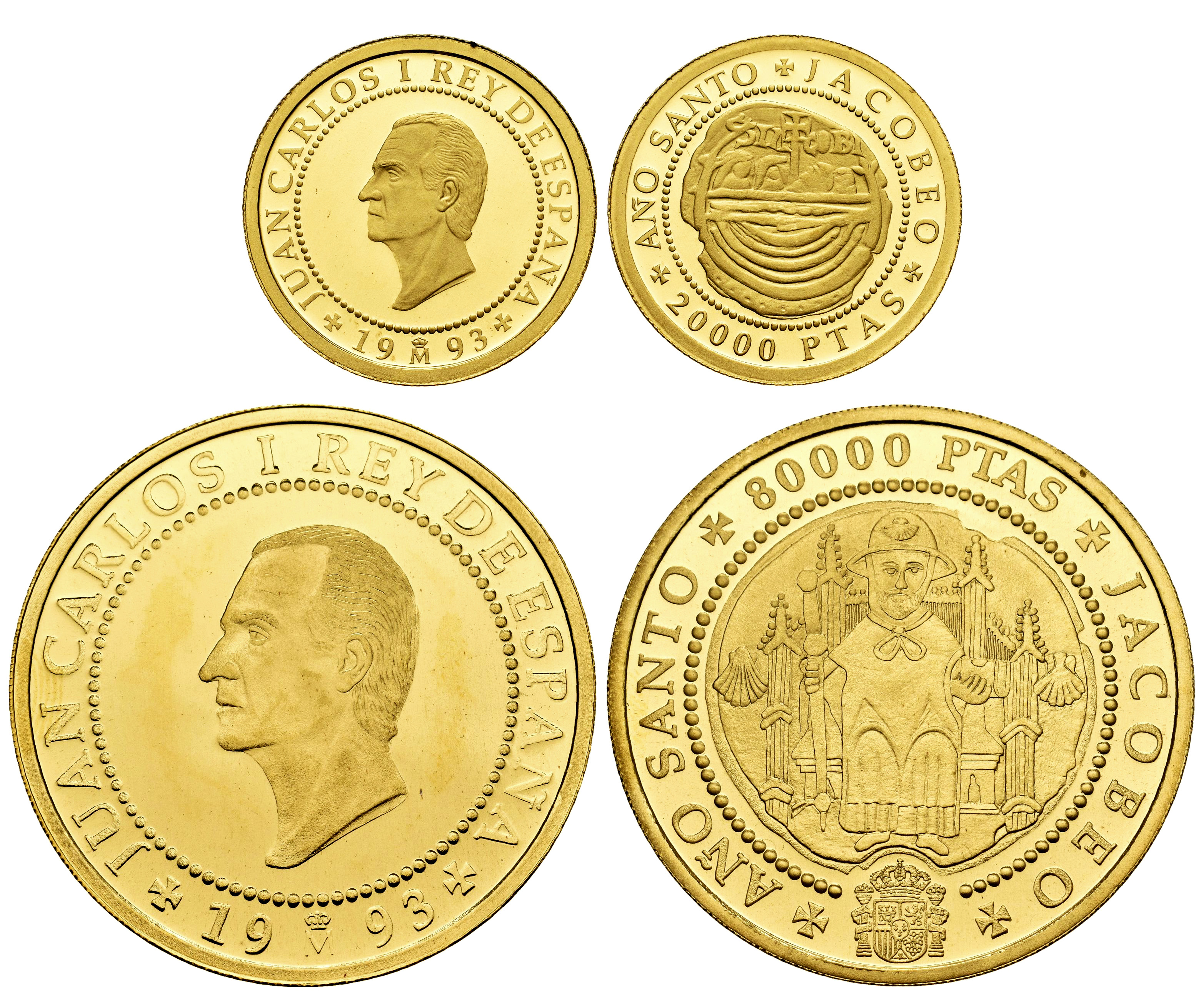 Juan Carlos I (1975-2014). 20.000 Pesetas y 80.000 Pesetas. 1993. Madrid. (Km-929/30). (Numista-102437/102547). 6,81 g. y 27,01 g. Au. Año Santo Jacobeo. PROOF. Est...4000,00.