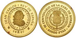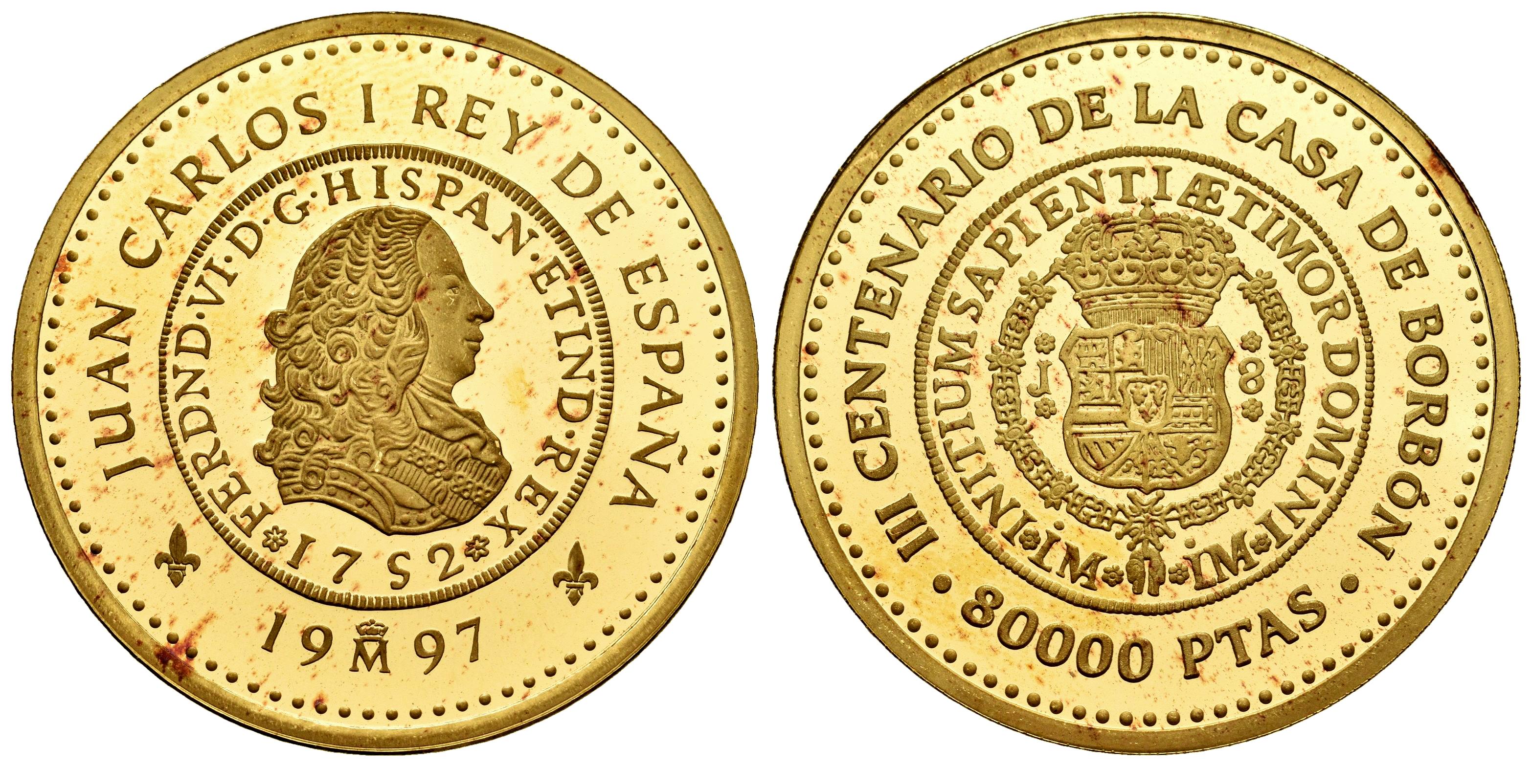 Juan Carlos I (1975-2014). 80000 pesetas. 1997. Madrid. (Km-1028). (Numista-102562). Au. 27,00 g. III Centenario de la Casa de Borbón. Manchitas. PROOF. Est...4000,00.