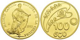 Juan Carlos I (1975-2014). 100 Ecu. 1992. Madrid. (Km-M38). (Numista-93034). Au. 34,46 g. Madrid Capital Europea de la Cultura. PROOF. Est...4000,00.