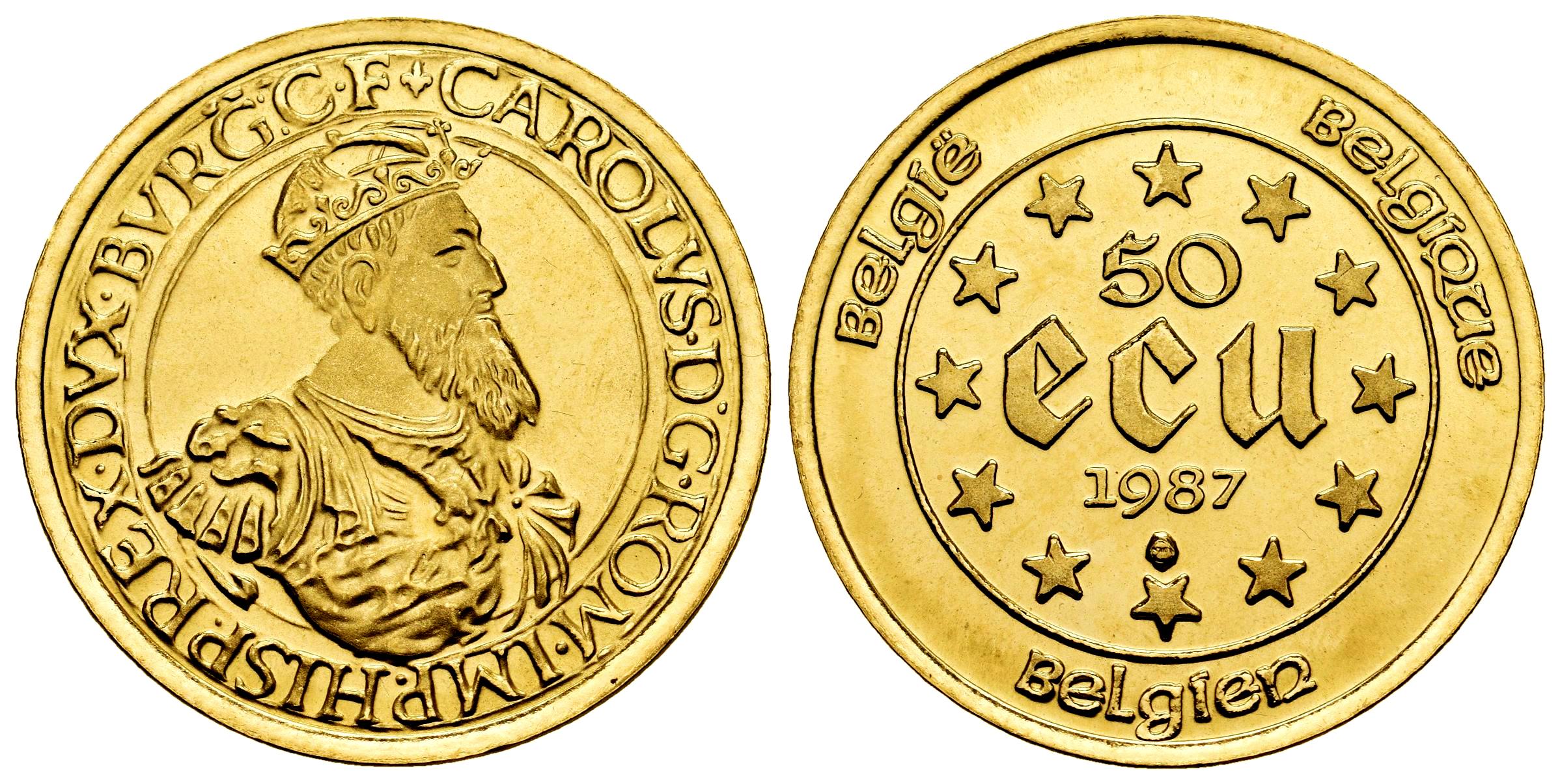 Bélgica. Baudouin I (1951-1993). 50 Ecu. 1987. (Km-167). Au. 17,30 g. Carlos V. PROOF. Est...3000,00.