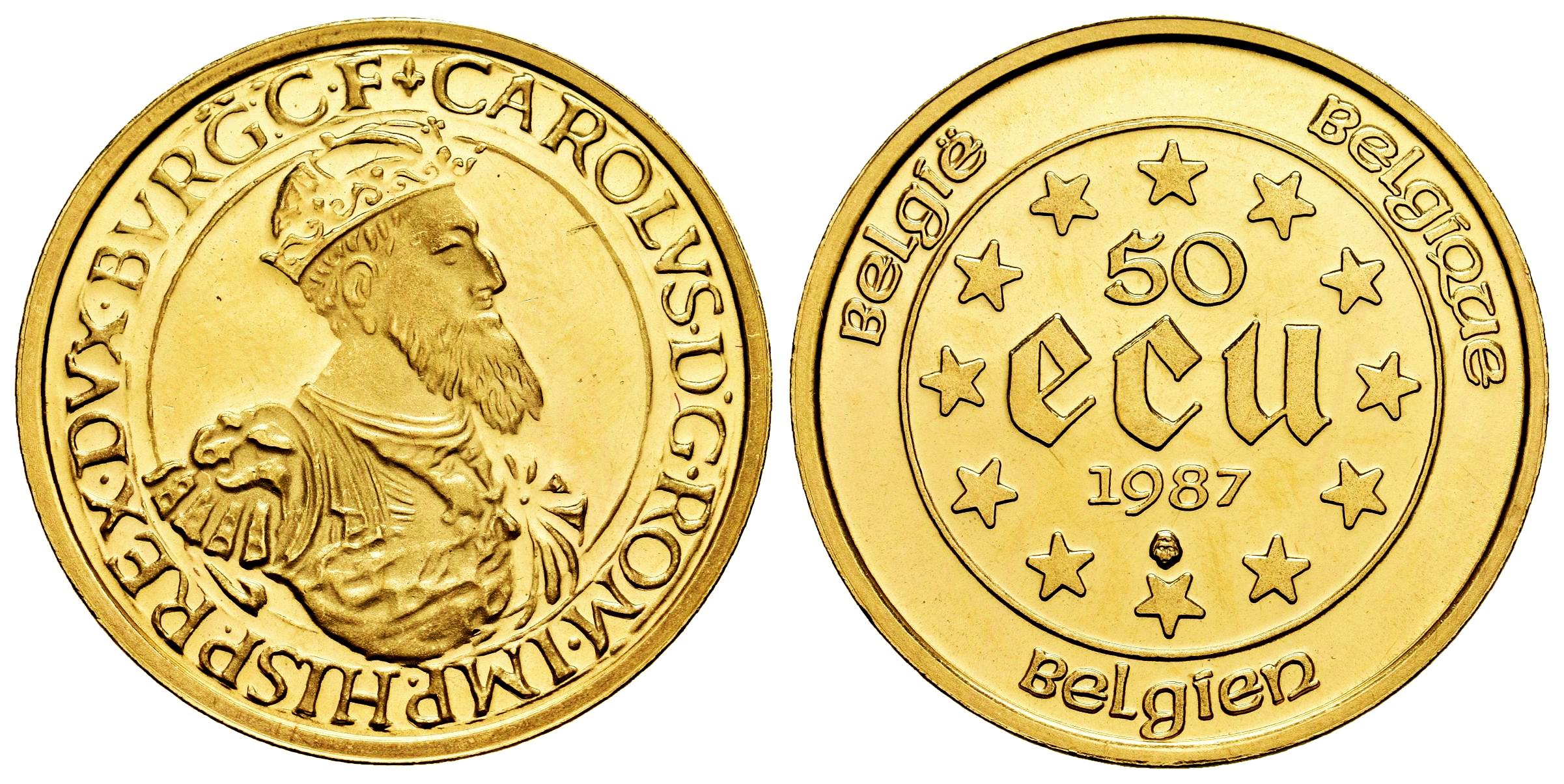 Bélgica. 50 ecus. 1987. (Km-167). (Fried-427). Au. 17,31 g. Pleno brillo original. PROOF. Est...1700,00.