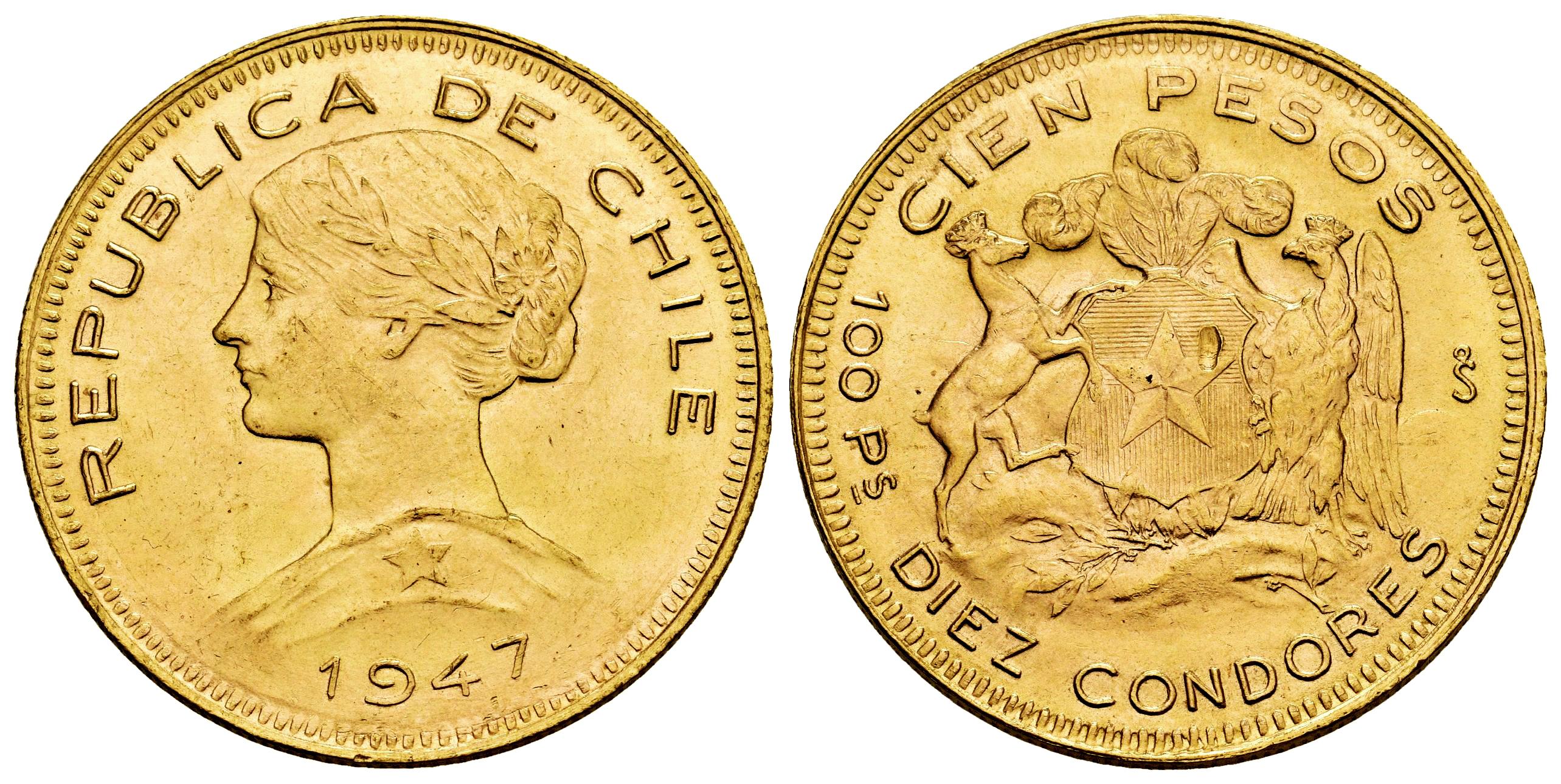 Chile. 100 pesos. 1947. Santiago. (Km-170). (Fried-54). Au. 20,37 g. Brillo original. SC-. Est...2000,00.