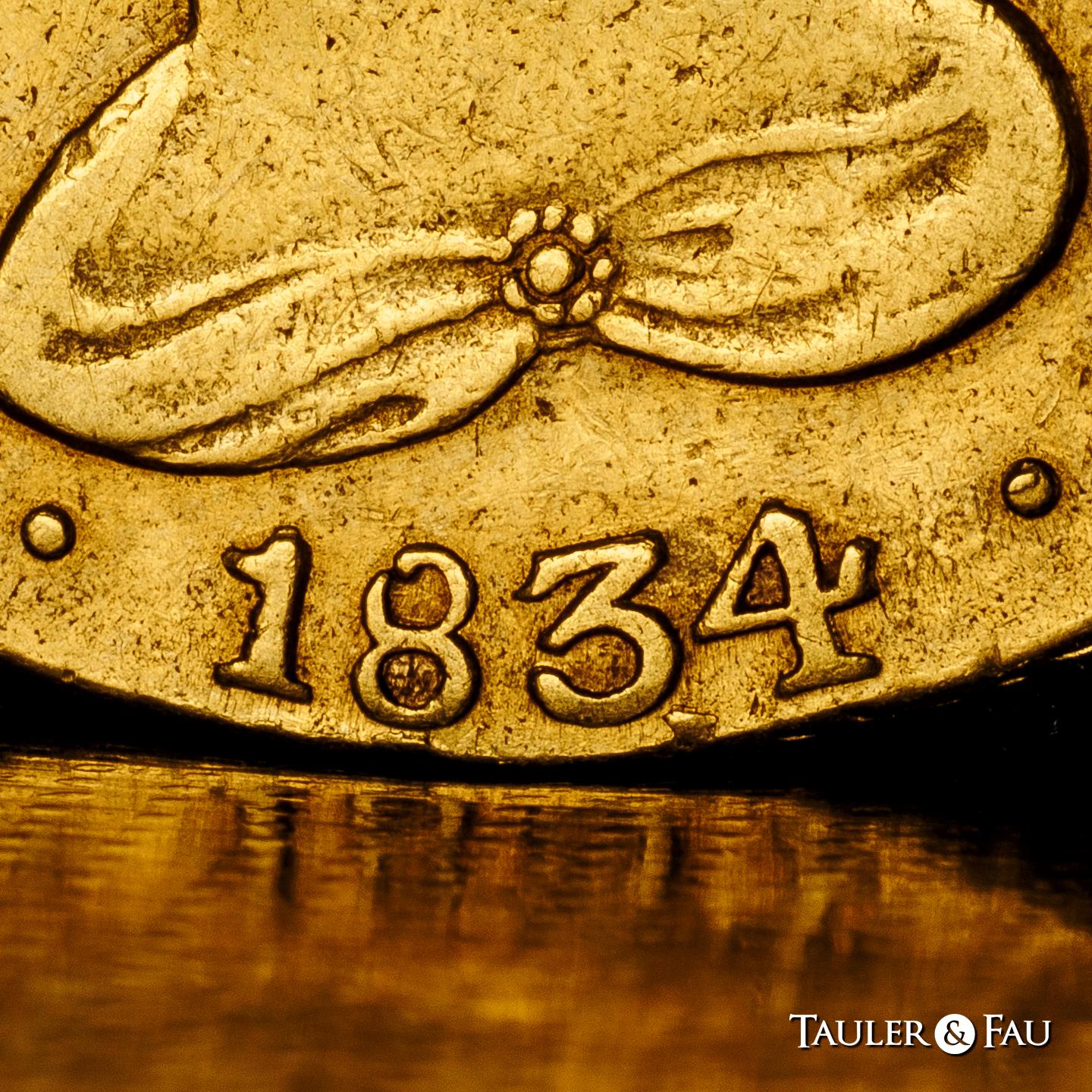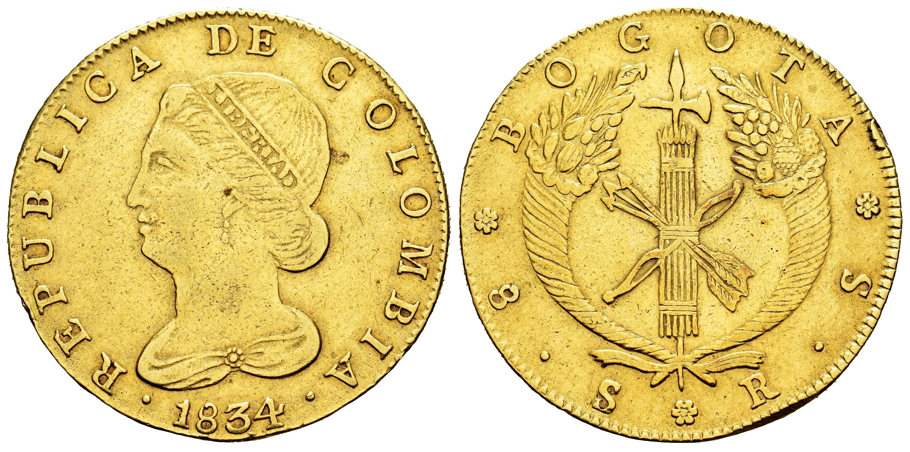 Colombia. 8 escudos. 1834. Bogotá. SR. (Km-82.1). (Fried-67). (Restrepo-165-27). Au. 26,90 g. Golpe en el canto y limadura en el borde del reverso. Limpiada. MBC+. Est...2600,00.