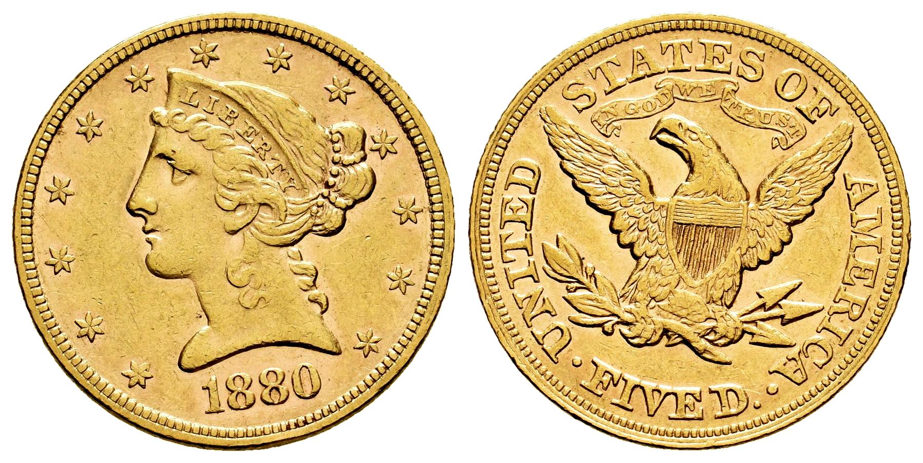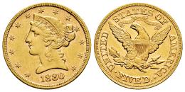 Estados Unidos. Liberty Half Eagles. 5 dollars. 1880. Philadelphia. (Km-101). (Fried-146). Au. 8,35 g. Restos de brillo original. EBC. Est...750,00.