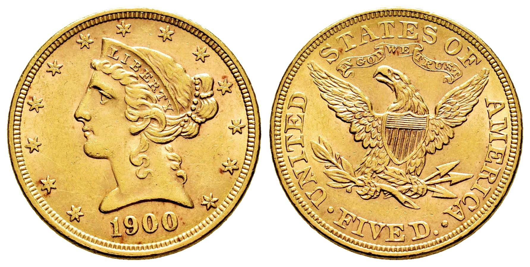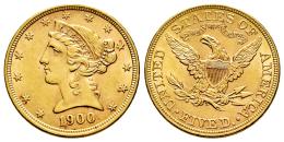 Estados Unidos. Liberty Half Eagles. 5 dollars. 1900. Philadelphia. (Km-101). (Fried-143). Au. 8,35 g. Leves marquitas. Bonito color. Restos de brillo original. EBC+. Est...750,00.