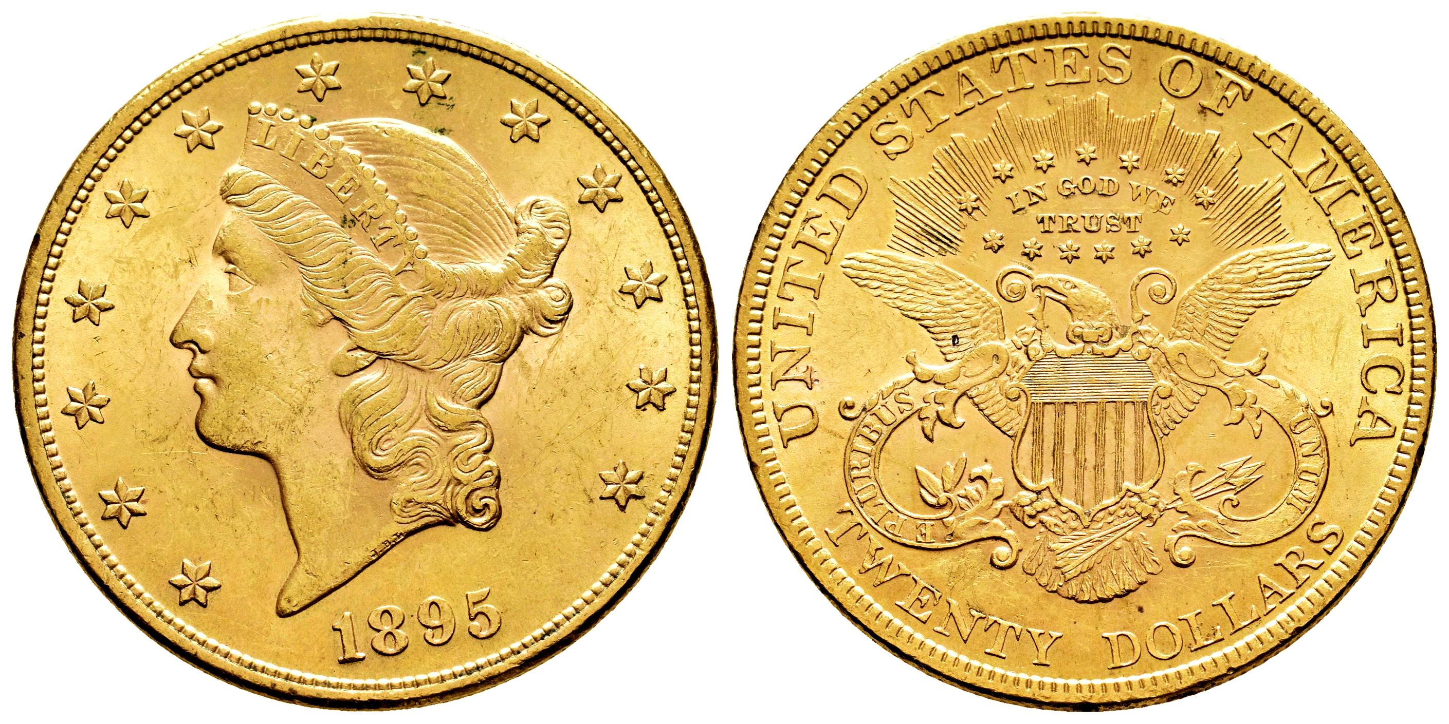 Estados Unidos. Liberty Double Eagles. 20 dollars. 1895. Philadelphia. (Km-74.3). (Fried-177). Au. 33,45 g. Leves rayas y golpecitos. Bonito color. Brillo original. EBC. Est...3200,00.