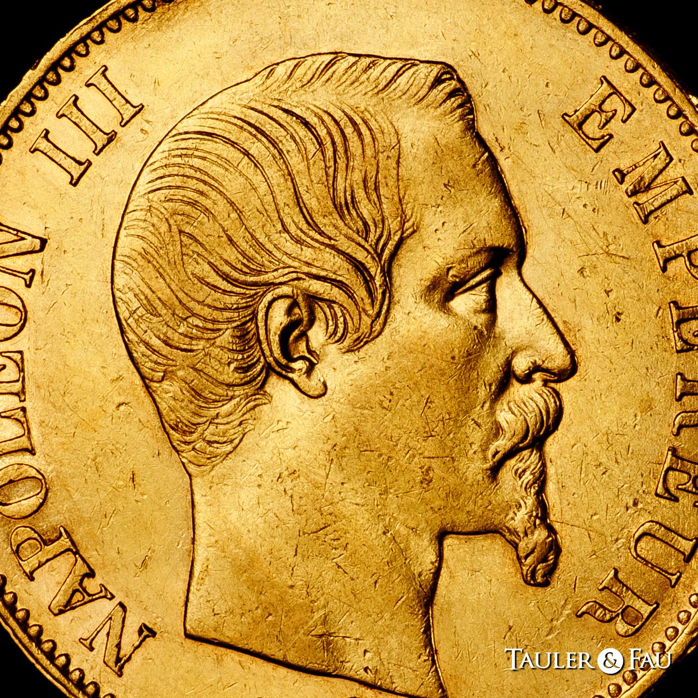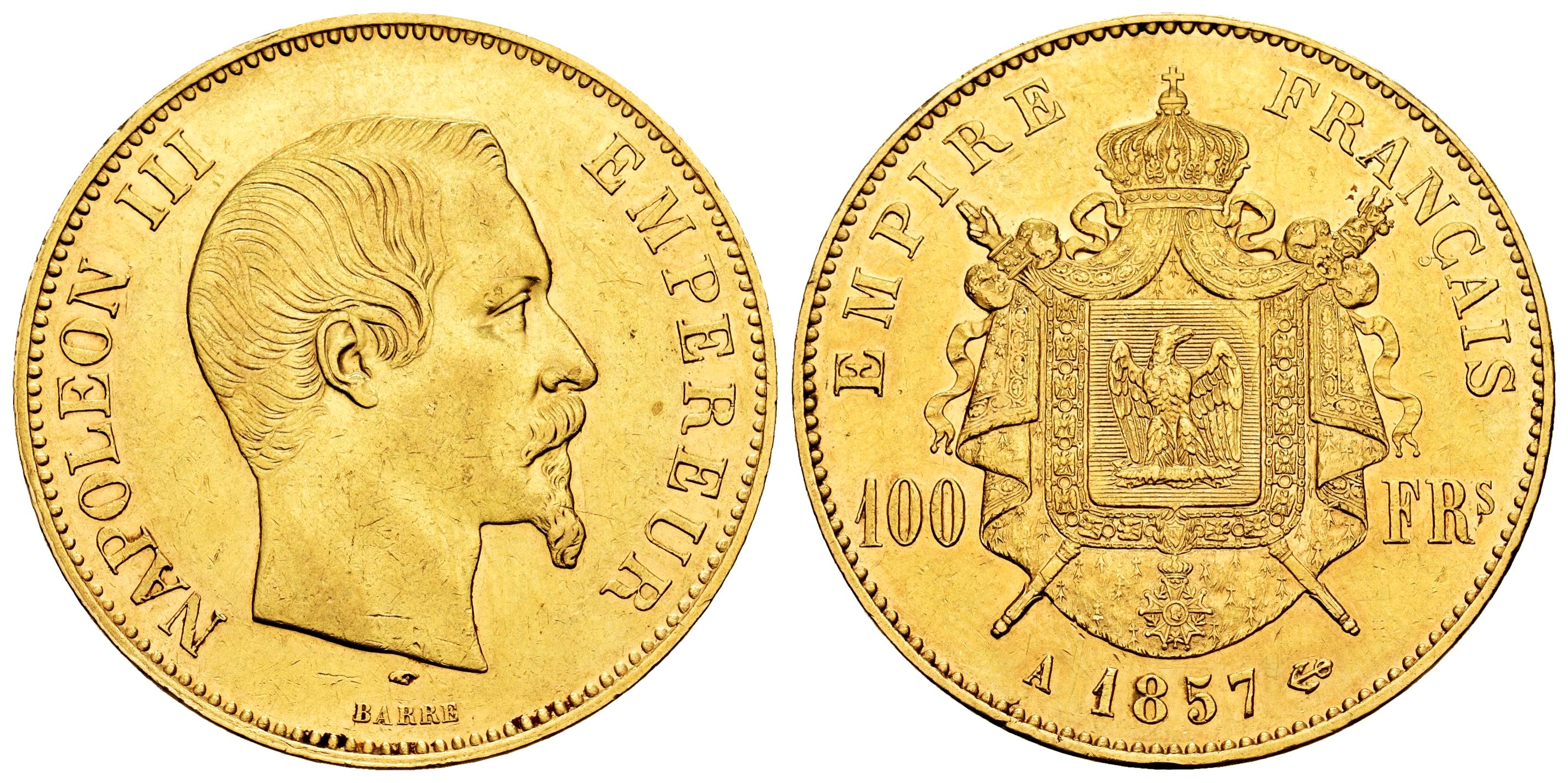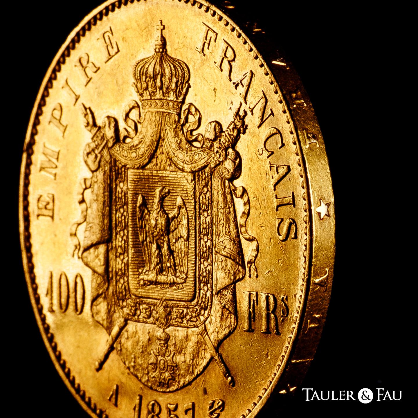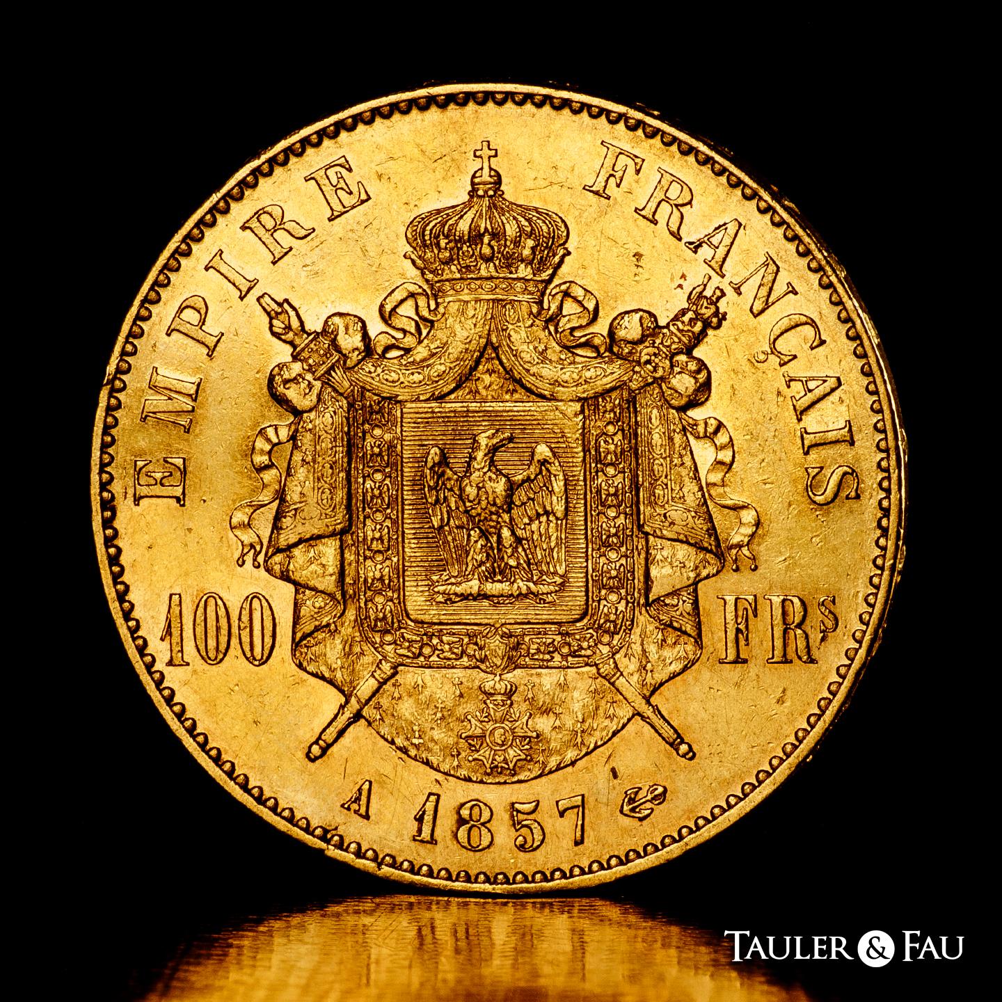 Francia. Napoleón III. 100 francs. 1857. París. A. (Km-786.1). (Fried-569). Au. 32,30 g. Golpecitos en el canto. Restos de brillo original. EBC-/EBC. Est...3200,00.