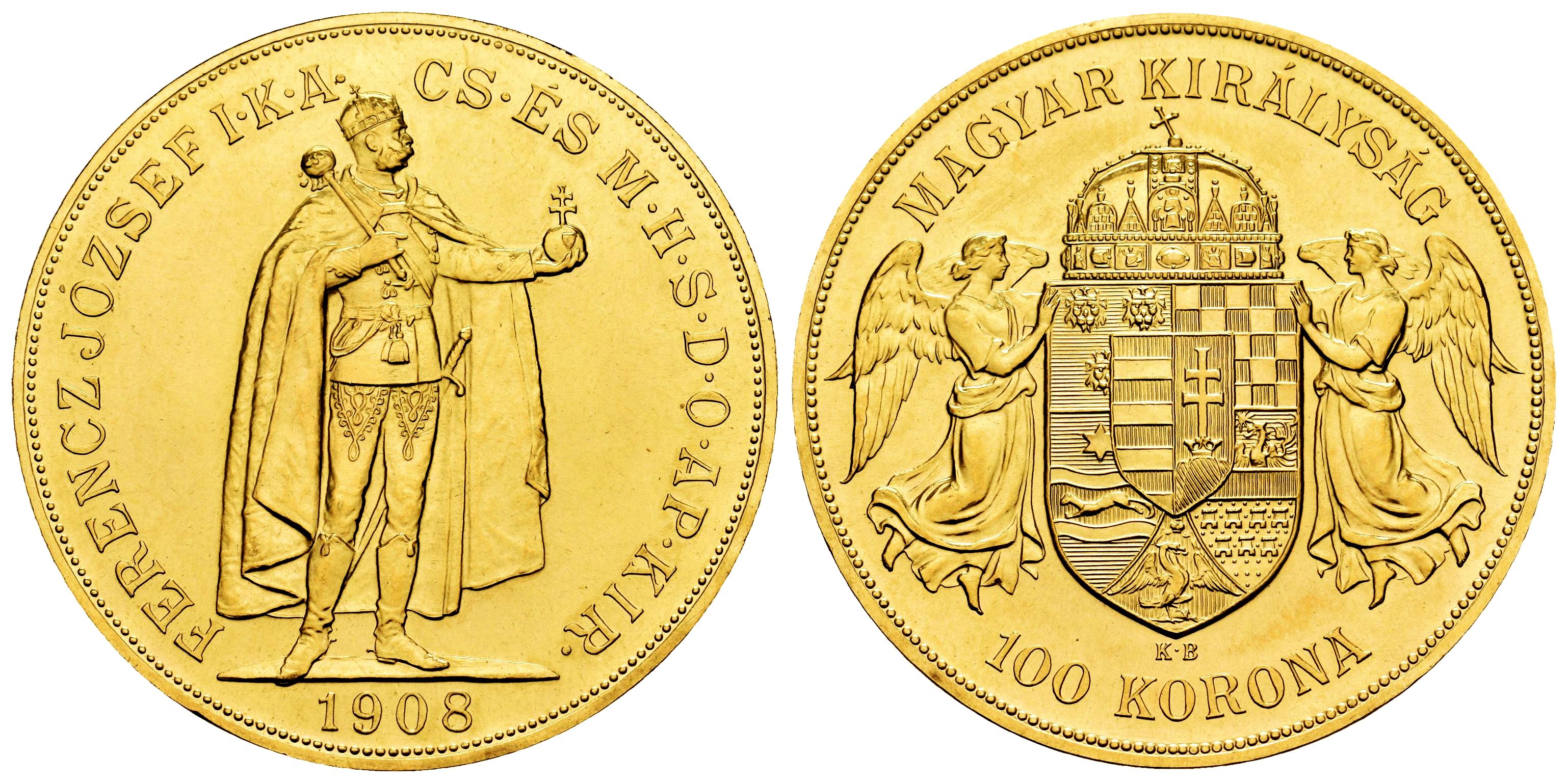 Hungría. Franz Joseph I (1848-1916). 100 coronas. 1908. Kremnitz. KB. (Km-491). (Fried-249R). Au. 33,91 g. Reacuñación oficial. Brillo original. SC. Est...3000,00.