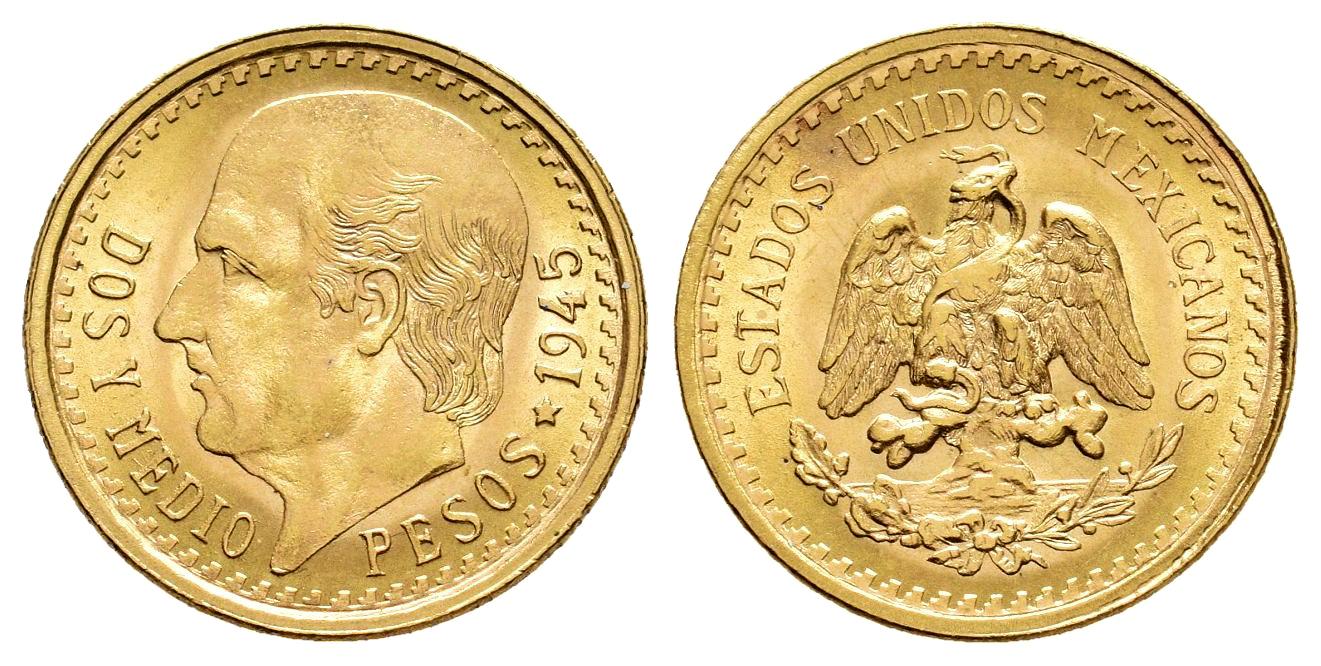 México. 2 1/2 pesos. 1945. México. (Km-463). (Fr-169). Au. 2,08 g. EBC+. Est...200,00.