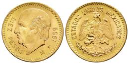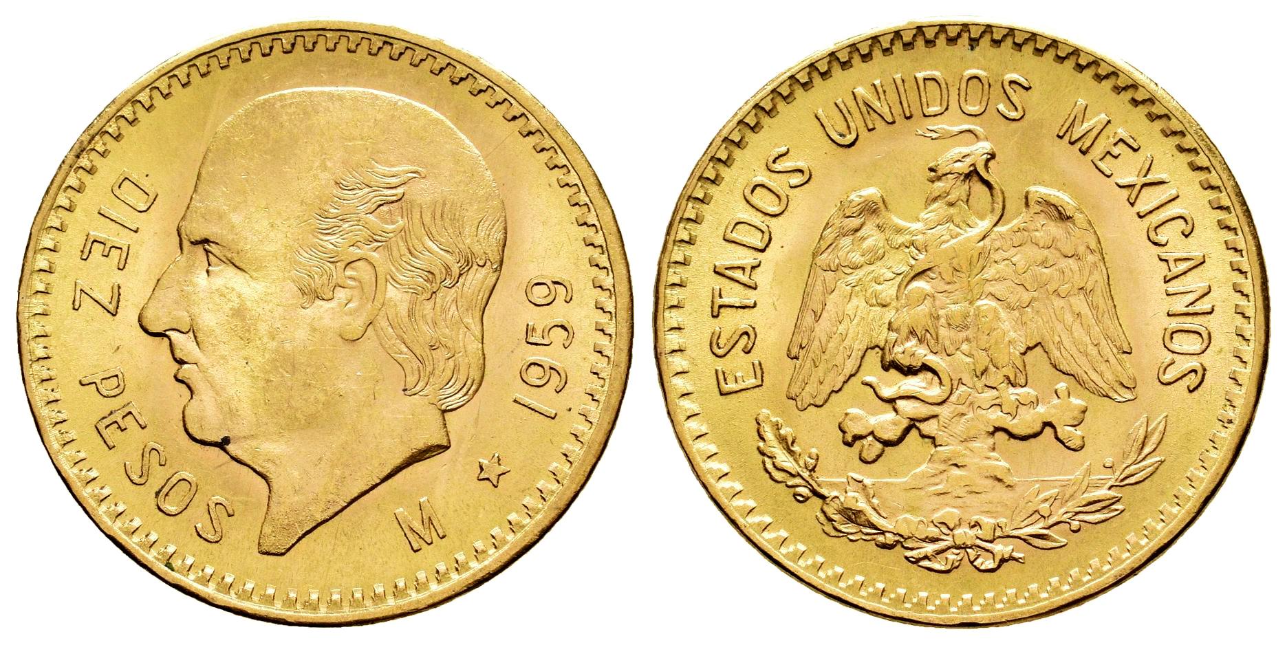 México. 10 pesos. 1959. (Km-473). (Fried-166R). Au. 8,35 g. Reacuñación. EBC. Est...750,00.