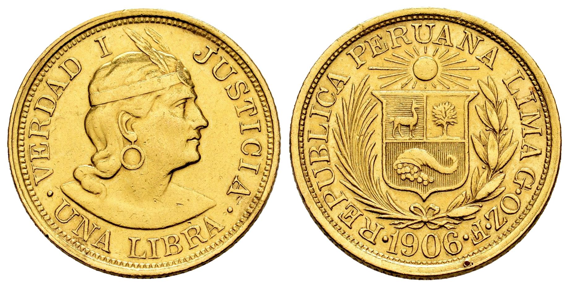 Perú. 1 libra. 1906. Lima. (Km-207). (Fried-75). Au. 7,95 g. Golpecitos en el canto. MBC+. Est...750,00.