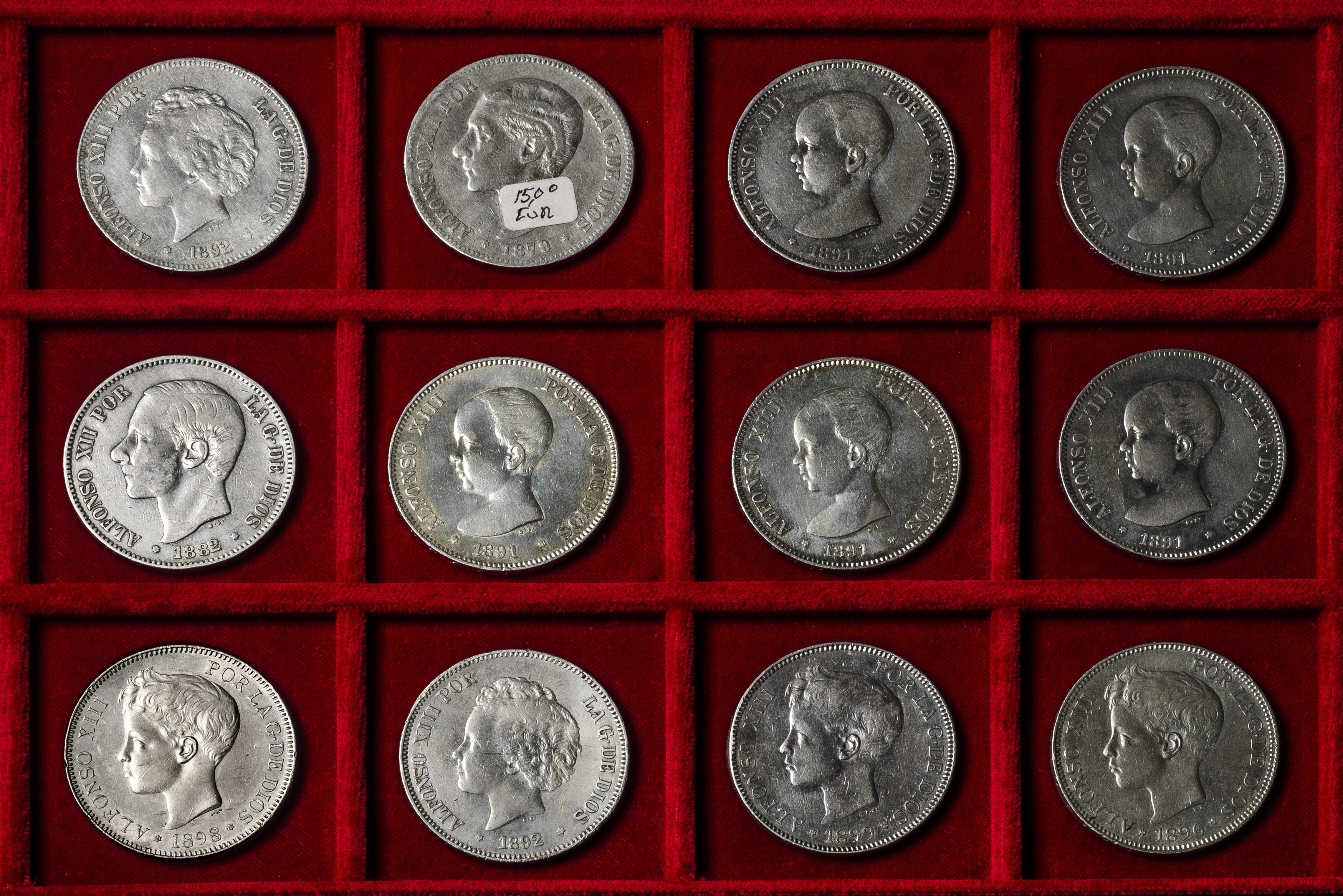 Centenario de la Peseta (1868-1931). Lote de 12 monedas de 5 pesetas. Variedad de reyes y fechas. Ag. 298,71 g. 0,900 milésimas. Es imprescindible un riguroso examen. SOLO ENVÍO A ESPAÑA PENÍNSULA. NO SE ADMITE DEVOLUCIÓN. BC+/MBC+. Est...500,00.