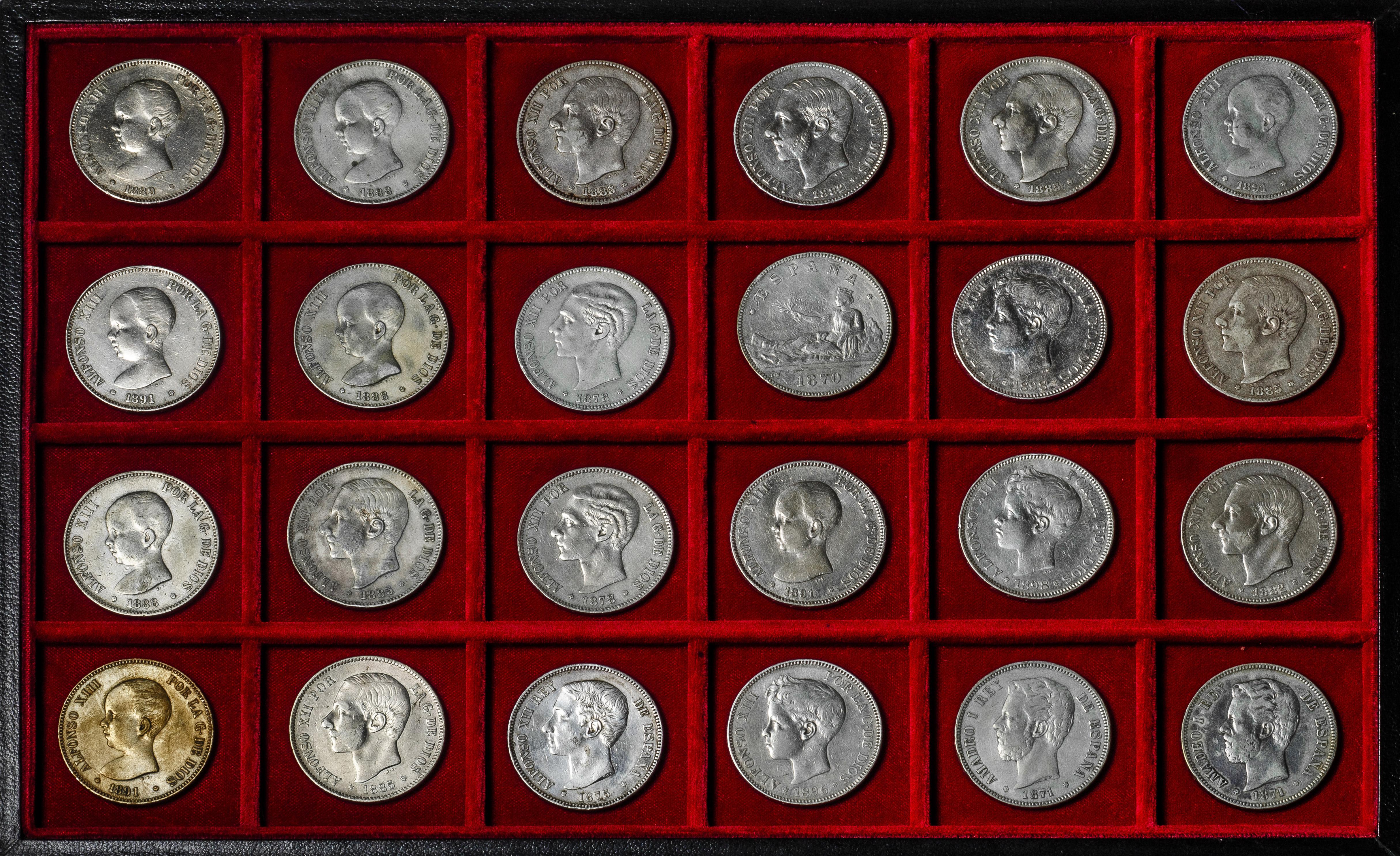 Centenario de la Peseta (1868-1931). Lote de 24 monedas de 5 pesetas. Variedad de reyes y fechas. Ag. 596,31 g. 0,900 milésimas. Es imprescindible un riguroso examen. SOLO ENVÍO A ESPAÑA PENÍNSULA. NO SE ADMITE DEVOLUCIÓN. BC+/MBC+. Est...1000,00.