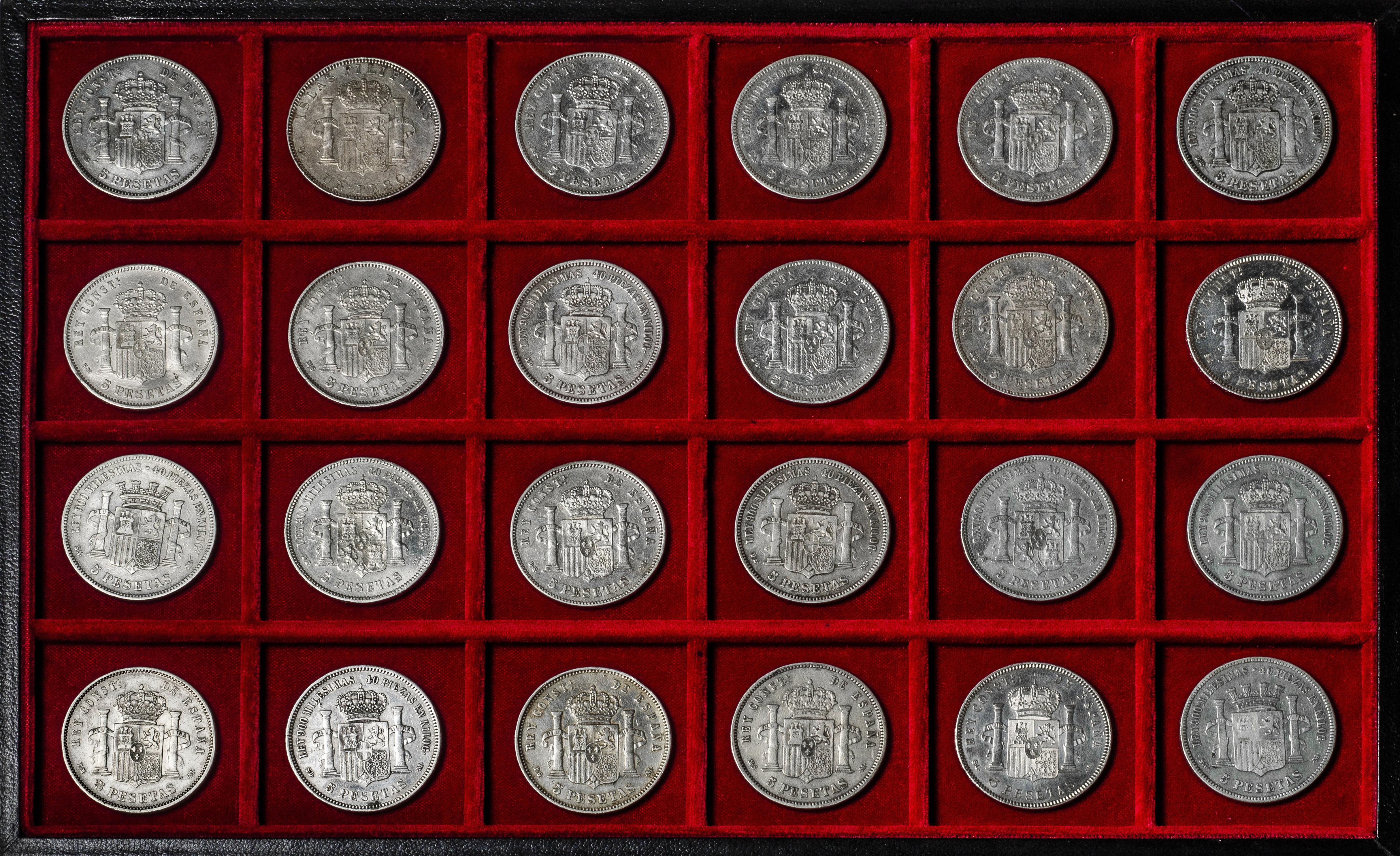 Centenario de la Peseta (1868-1931). Lote de 24 monedas de 5 pesetas. Variedad de reyes y fechas. Ag. 595,94 g. 0,900 milésimas. Es imprescindible un riguroso examen. SOLO ENVÍO A ESPAÑA PENÍNSULA. NO SE ADMITE DEVOLUCIÓN. BC+/MBC+. Est...1000,00.
