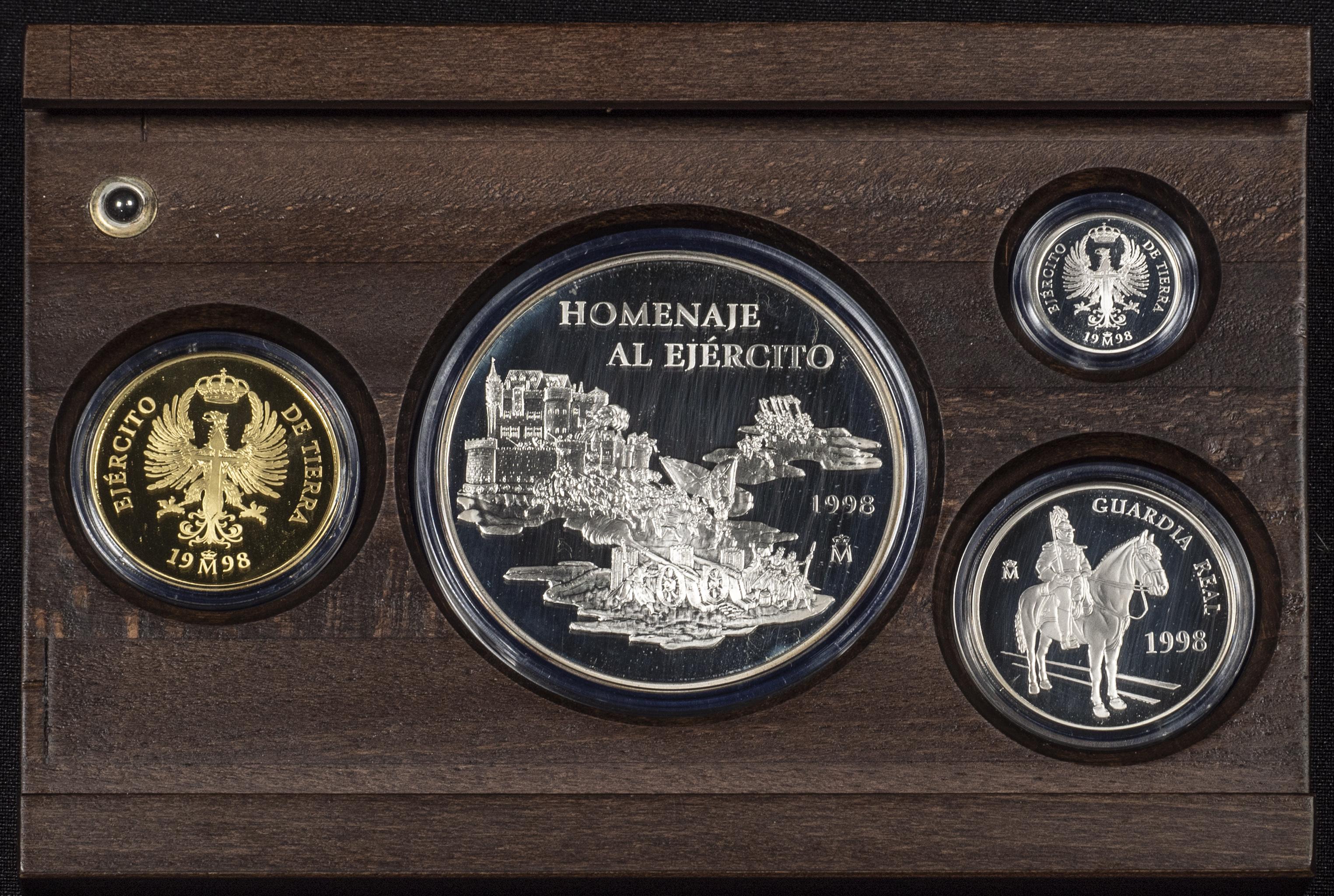 Juan Carlos I (1975-2014). Serie de 4 monedas. Homenaje al Ejército de Tierra Español. 1998. 1, 5, 25 y 200 Euro. Ar 209,09 g. /Au 34,55 g. Presentado en estuche oficial. PROOF. Est...5500,00.